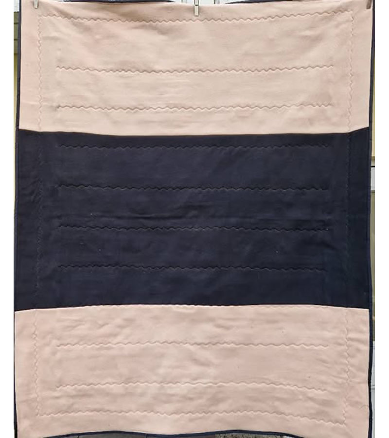 Et denim tæppe til en “farveforskrækket”. Midterfeltet er fra et dødsbo, indramning fra eget lager, bagsiden er tyk fleece doneret af Lene Antonisen, Maribo. Lisbeth Lau Adrian har quiltet.