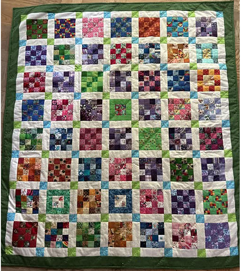 Anne Marie Mouritzen, Harring , har syet dette fine tæppe. Mønster er “Præstø” fra HANNES patchwork. Stof fra restekassen skriver Anne Marie.