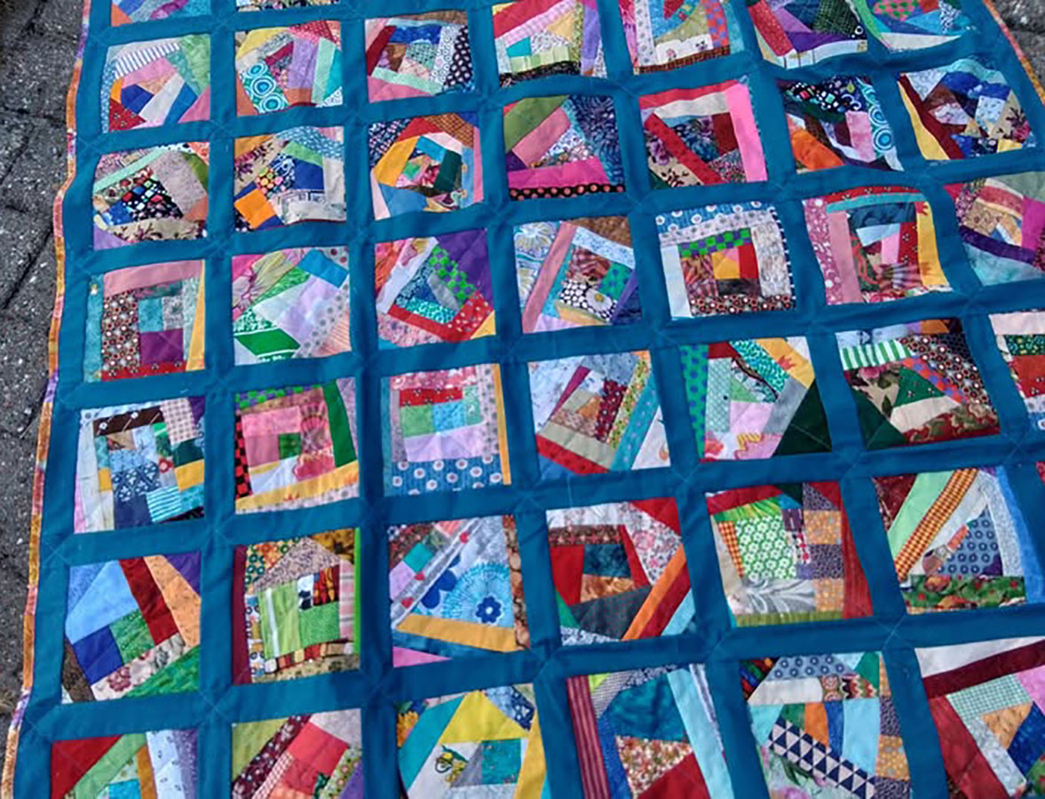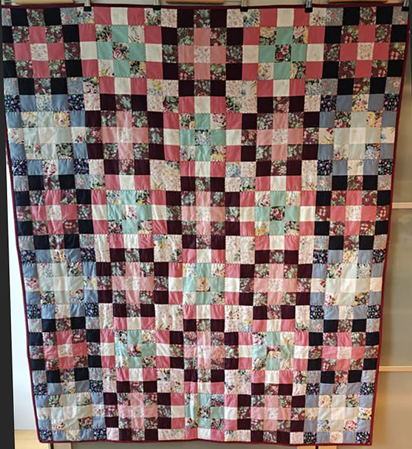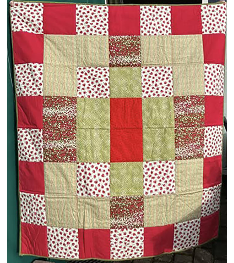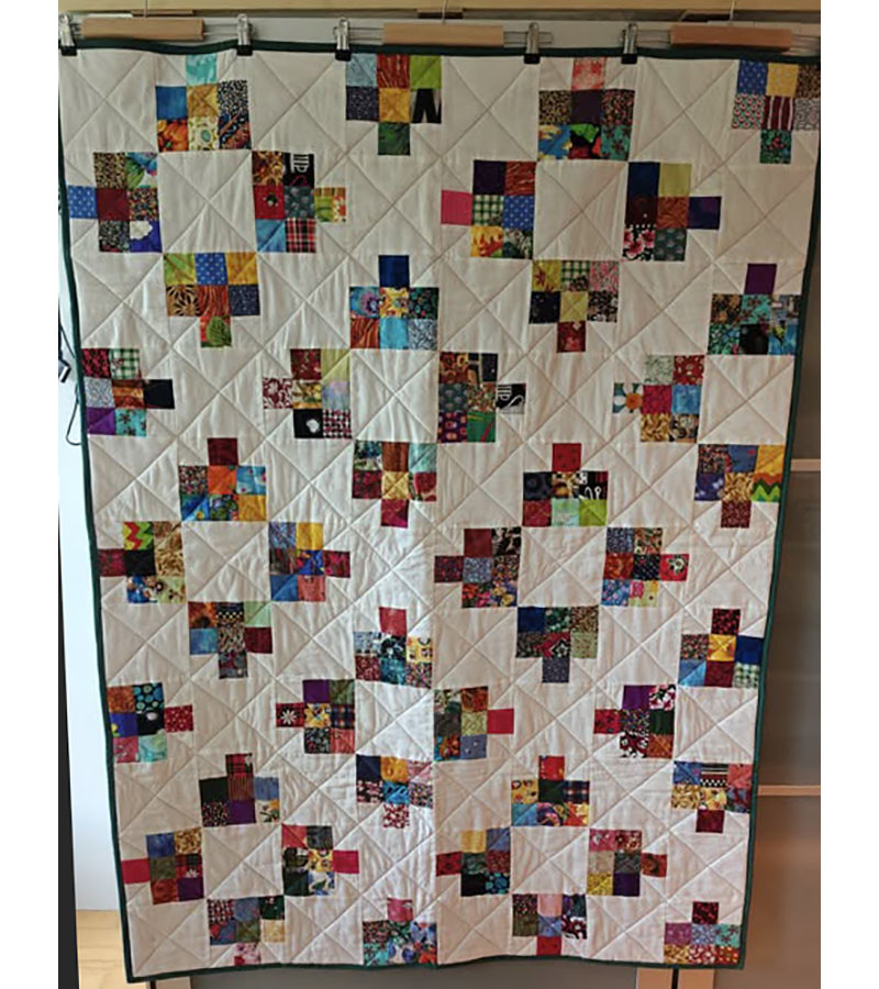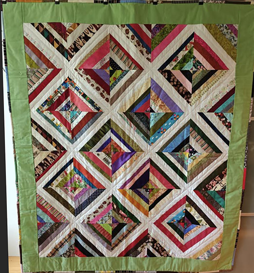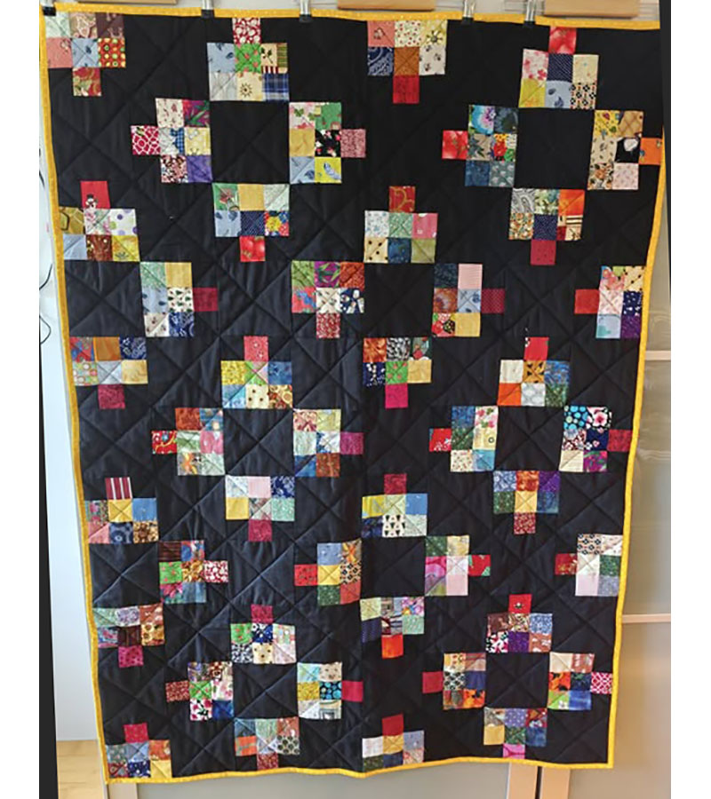 Anne Marie Mouritzen, Harring , har syet dette fine tæppe. Mønster er “Præstø” fra HANNES patchwork. Stof fra restekassen skriver Anne Marie.