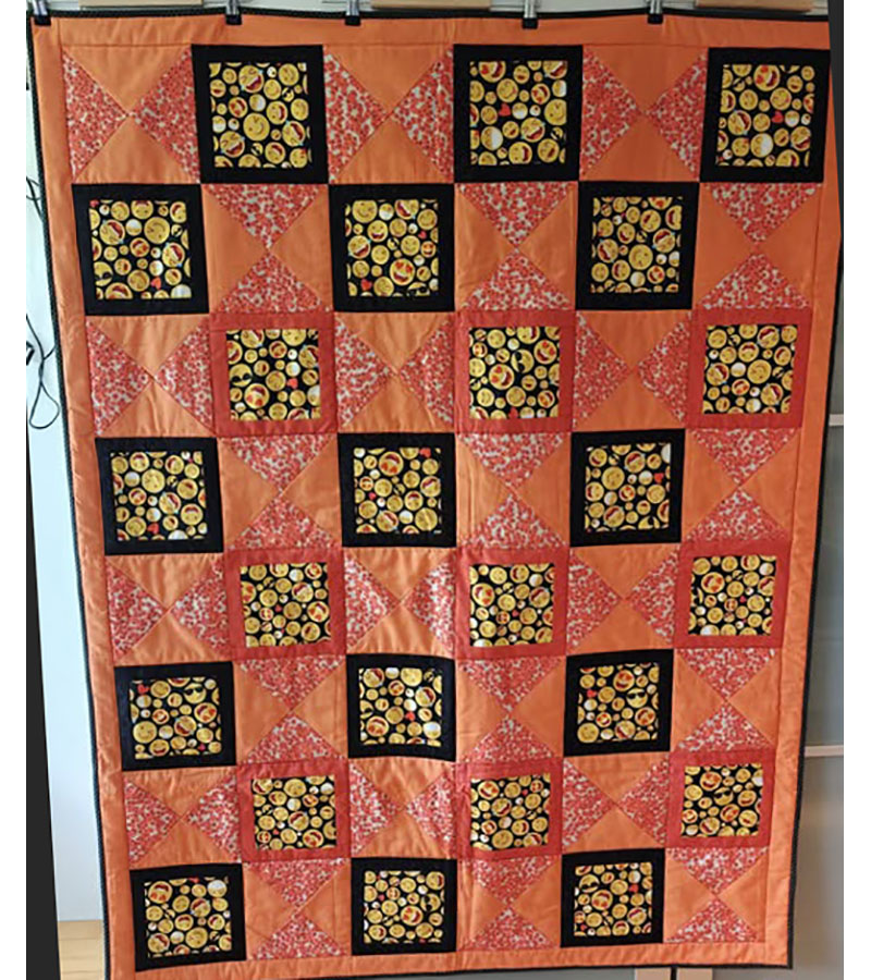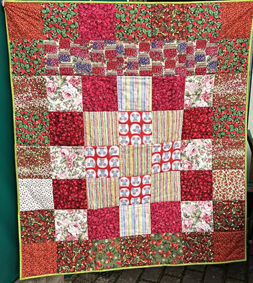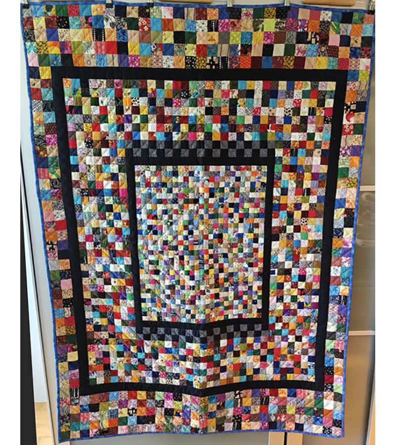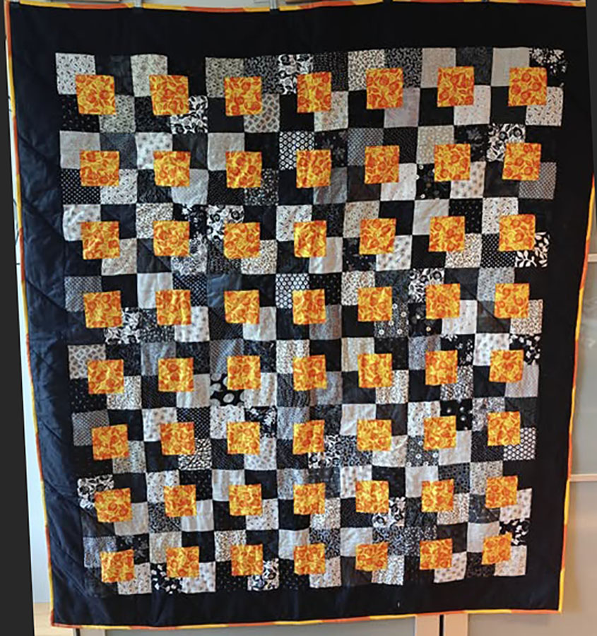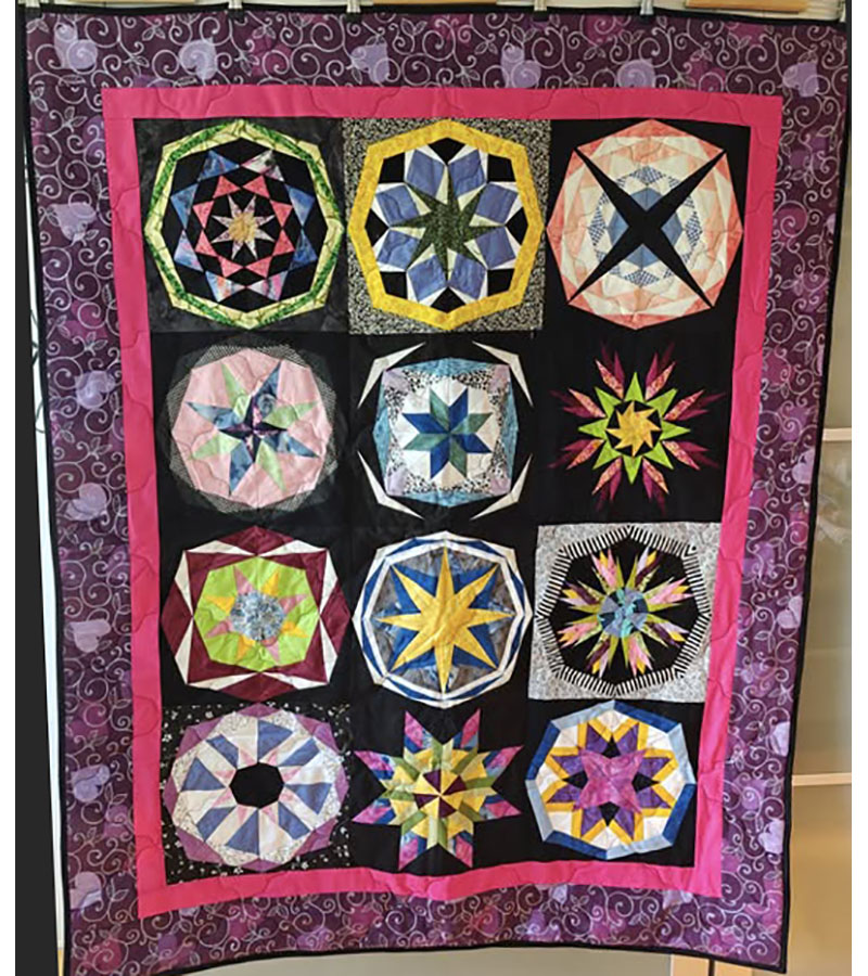 Anne Marie Mouritzen, Harring , har syet dette fine tæppe. Mønster er “Præstø” fra HANNES patchwork. Stof fra restekassen skriver Anne Marie.