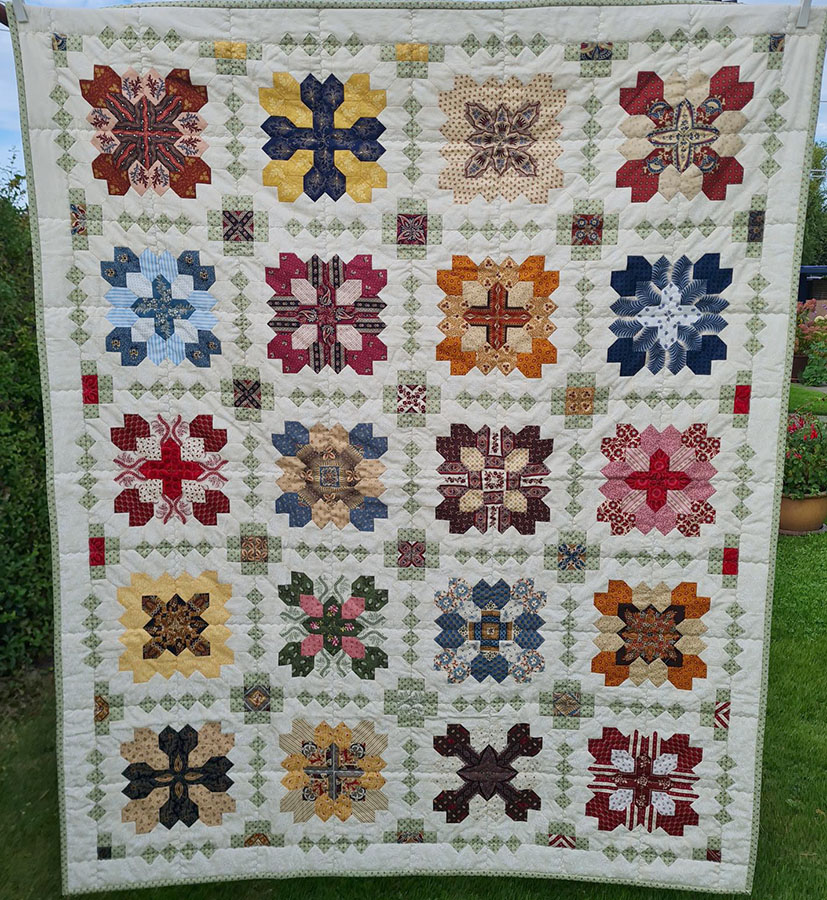 En anonym har syet det fine top, og Mette Ebbesen, Tved, har monteret og quiltet. Mellemfor er finansieret ved bogsalg, og bagsiden er doneret af boet efter Birthe Nørlund.