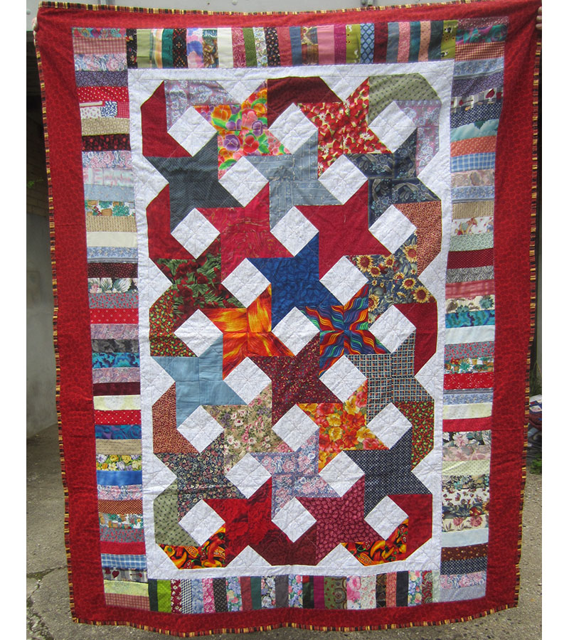 Ser du ringe eller stjerner? Ulla Knudsgaard, Risskov, har syet det flotte puttetæppe, hvor hun nar brugt et utal af forskellige stoffer både i kant og midte.