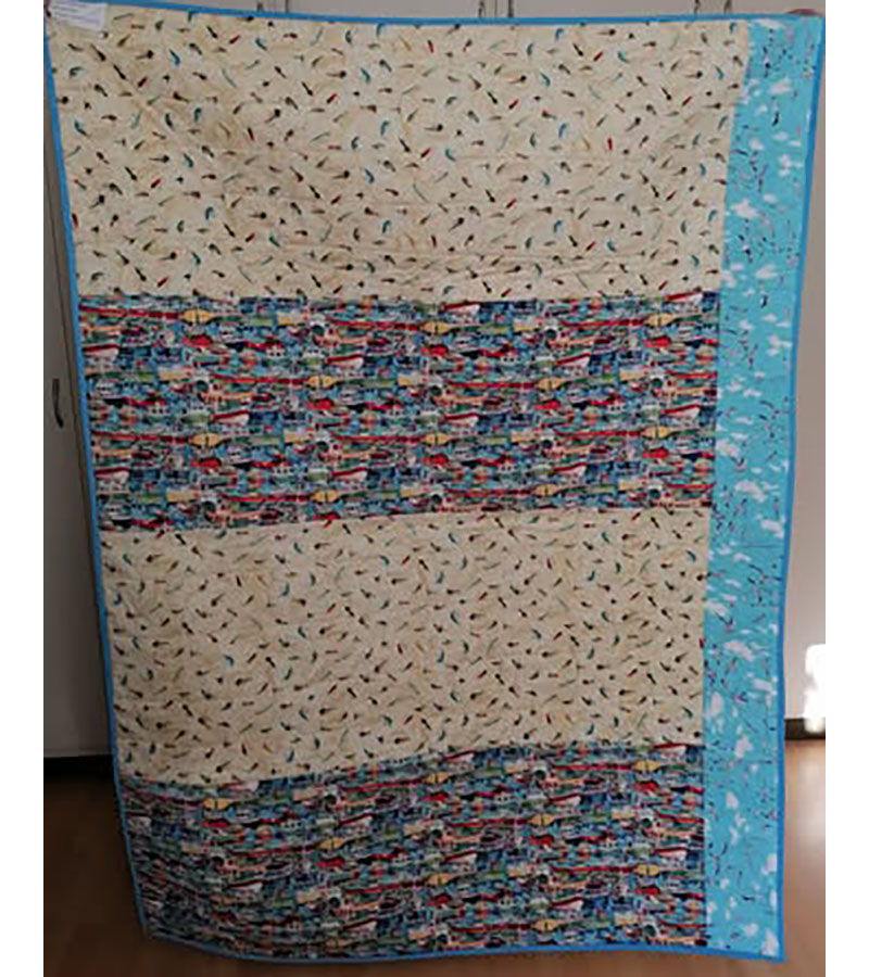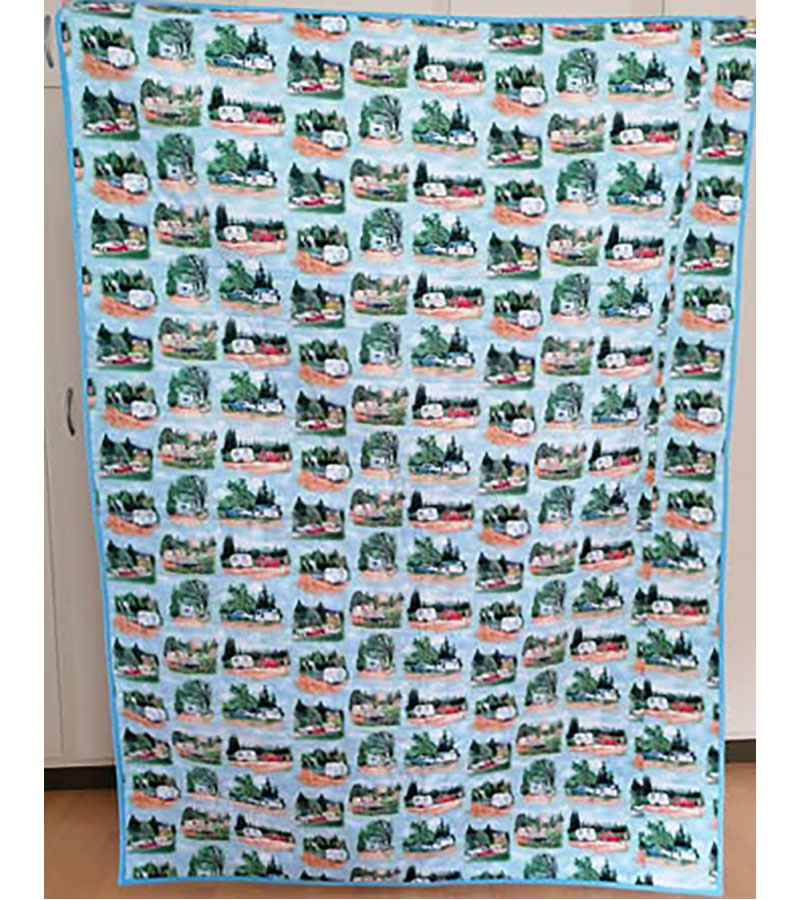 Lillian Nielsen, Fredericia har syet dette sommertæppe af donerede stoffer. Dejlige motiver af campingliv, skibe og lystfiskeri.