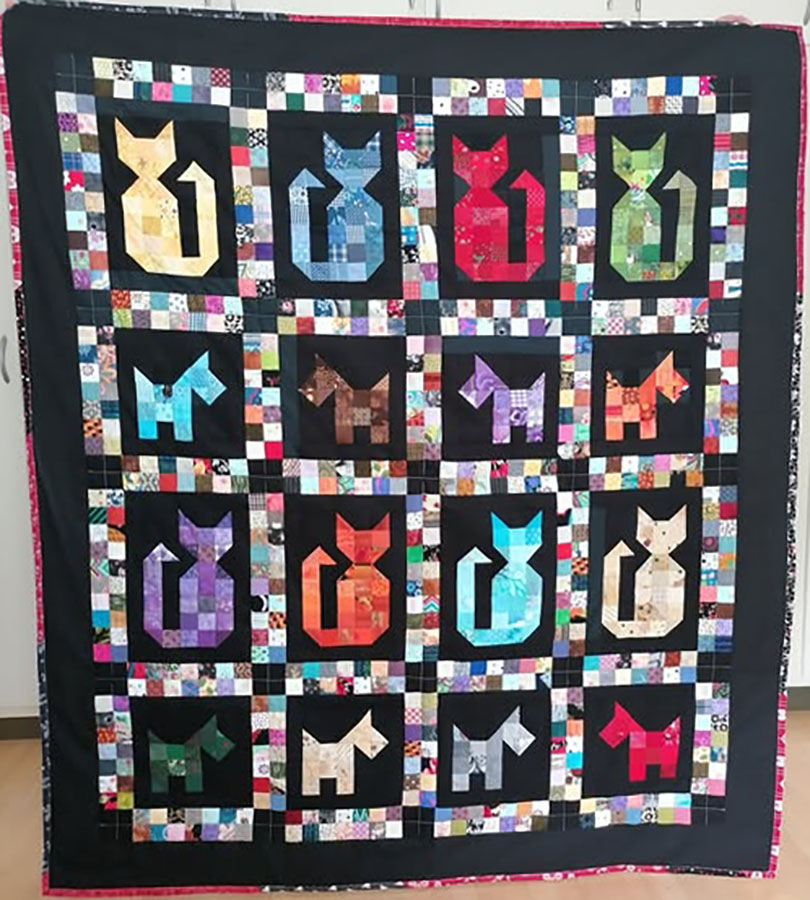 Lisa Pedersen har syet farverige hunde og katte. Mellemfor fra bogsalg. Bagsiden doneret af Ilse Iversen. Herdis Sommer har monteret og quiltet.