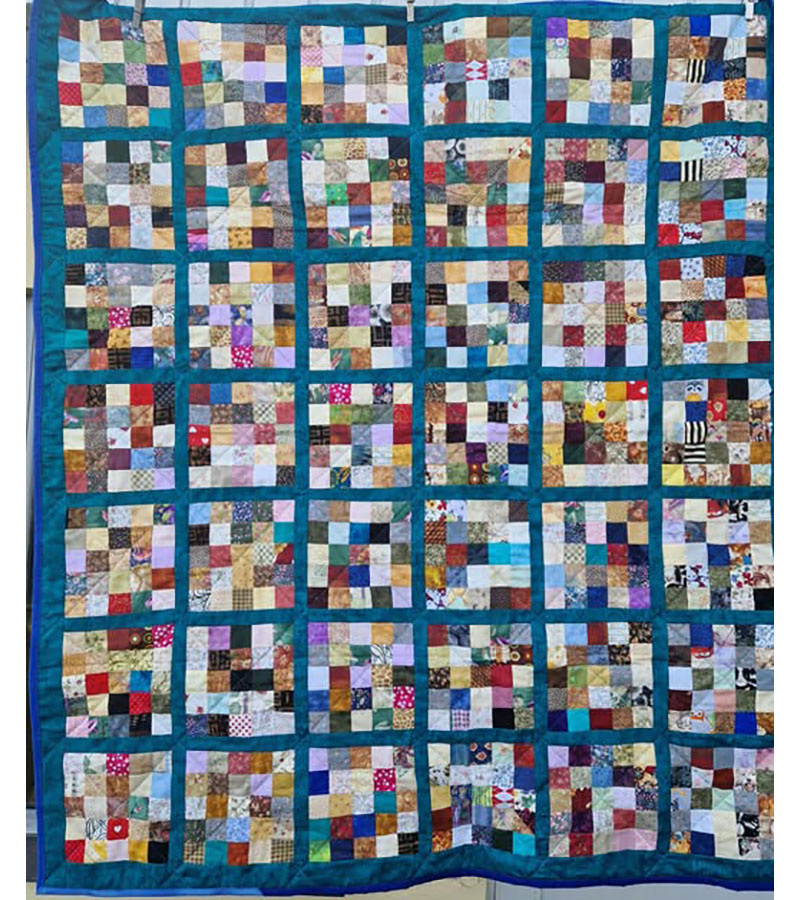 Restetop fra Malmø 24. oktober 2025 Af projektputte Rita Danielsen, Malmø, har syet restetoppen med fint petrolgrønt gitter. Lisbeth Adrian har quiltet med mellemfor finansieret af bogsalg, og bagside er fra lageret.