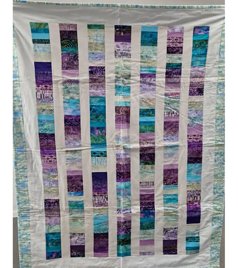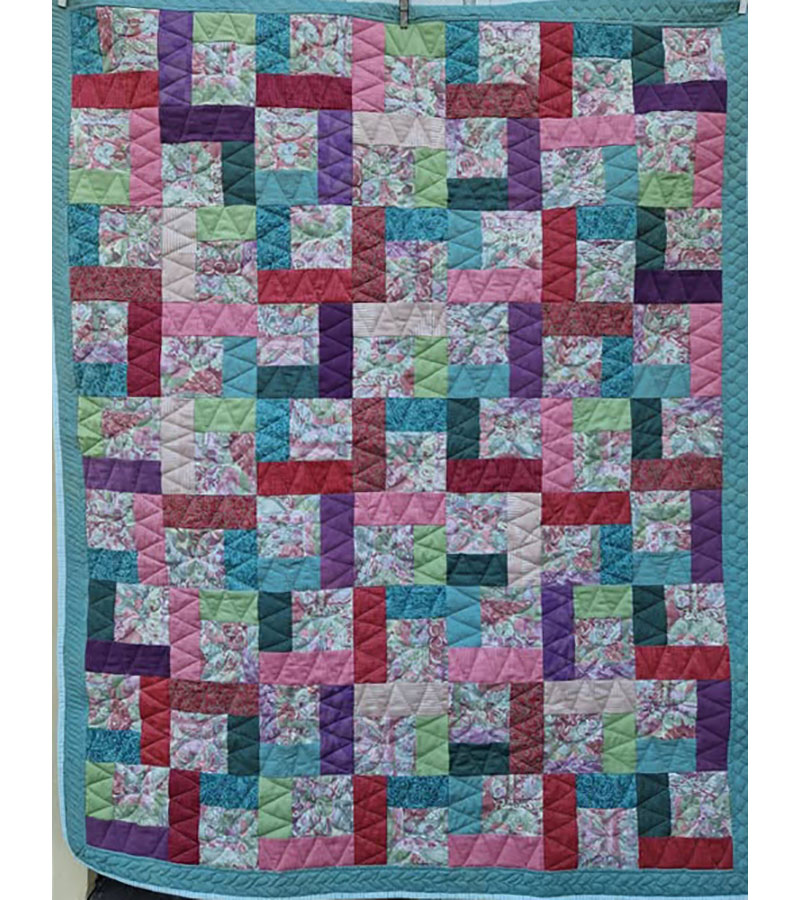 Aase Rosebi Sommer, Thurø, har syet toppen I fint afstemte farver. Annette K. Laursen har udført en elegant maskinquiltning, med mellemfor finansieret af bogsalg og bagside fra Aase.