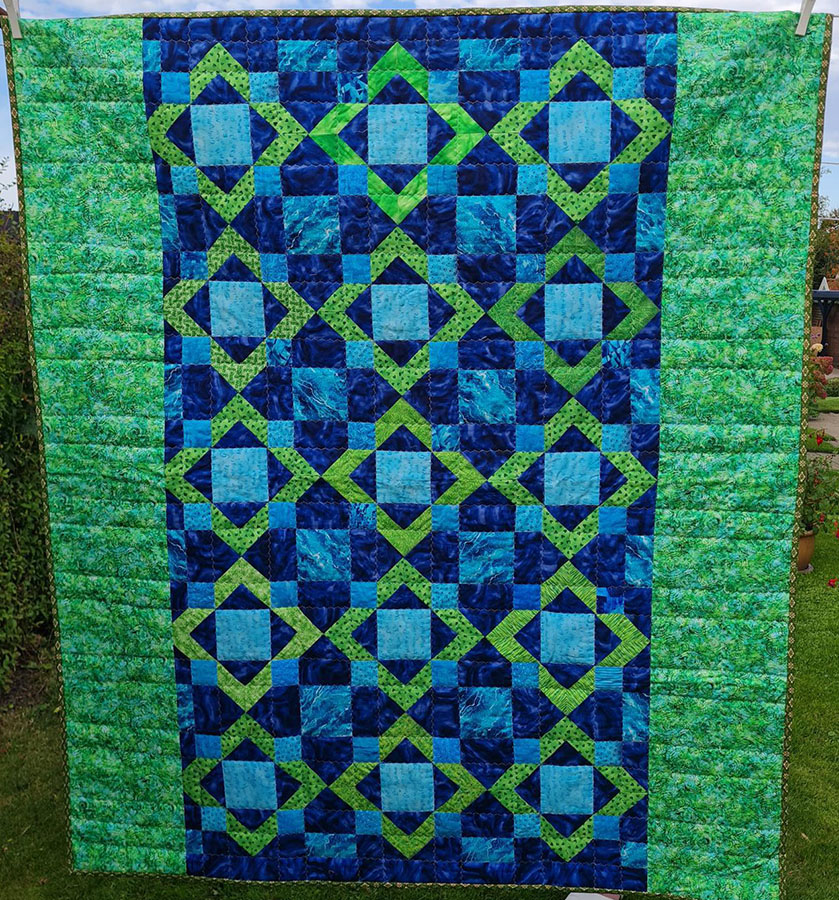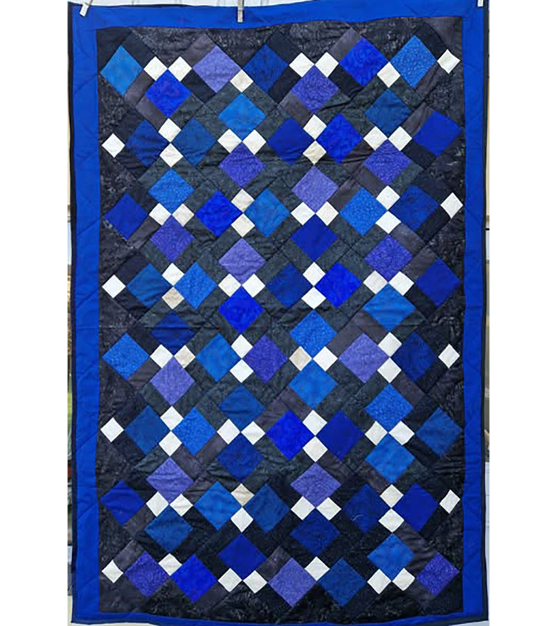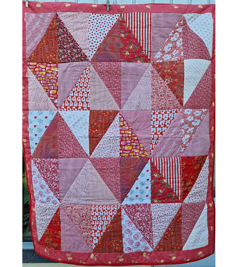 Den flotte iøjefaldende blå top er syet af Anne Christiansen, Flakkebjerg. Lisbeth Adrian har lavet en rød bagside af diverse rester, og quiltet med mellemfor finansieret af bogsalg.