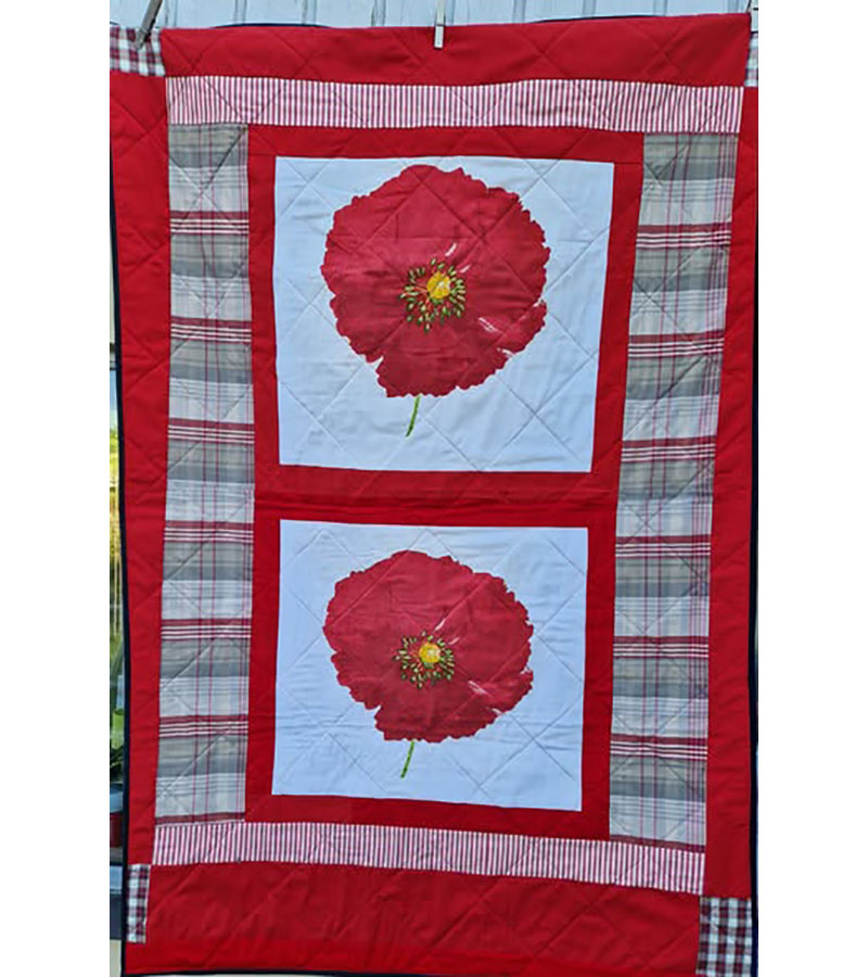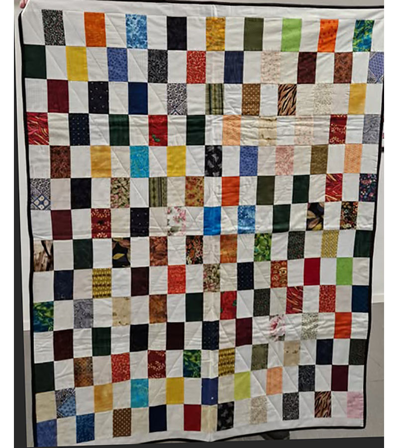 Lena Andersen, Skælskør, har syet toppen, mønsteret er Haderslev tæppet fra HANNES. Lisbeth Adrian har quiltet med mellemfor finansieret af bogsalg og bagside fra lageret.