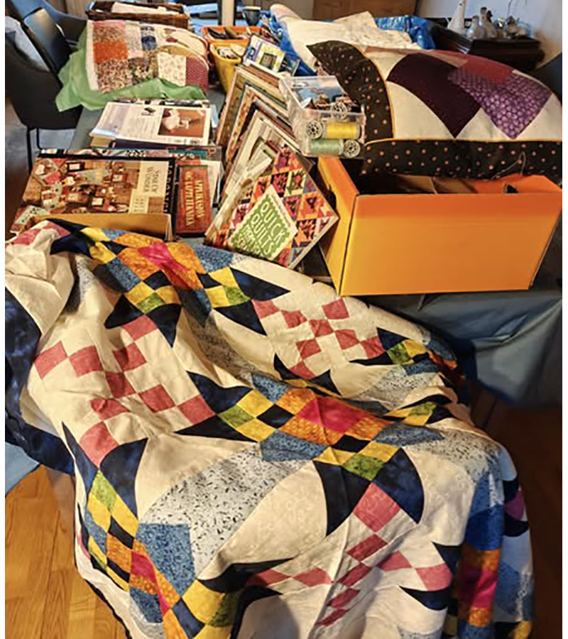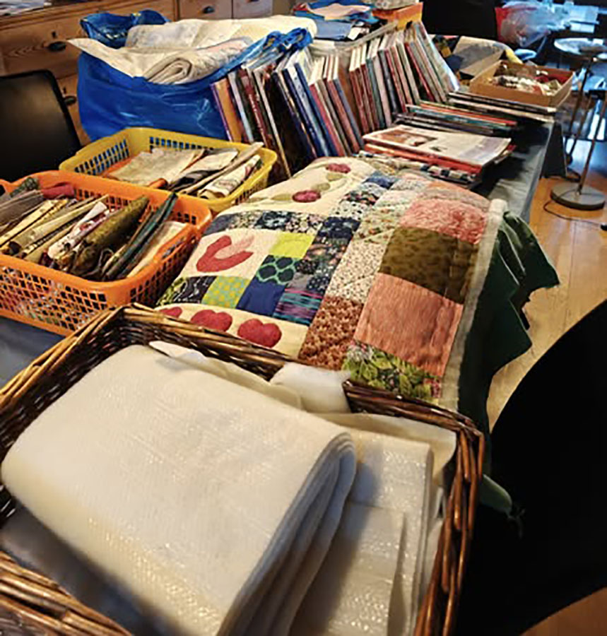 Der er mange bøger, stof, tråd, pappede blokke, færdige tæpper og toppe.
