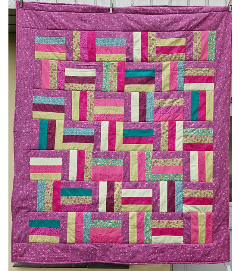 Striber lodret og vandret 31. oktober 2025 Af projektputte Flot pink/grønt strimmel tæppe fra Lisbeth Molin. På bagsiden blød fleece, doneret af Quiltequinderne I Greve.