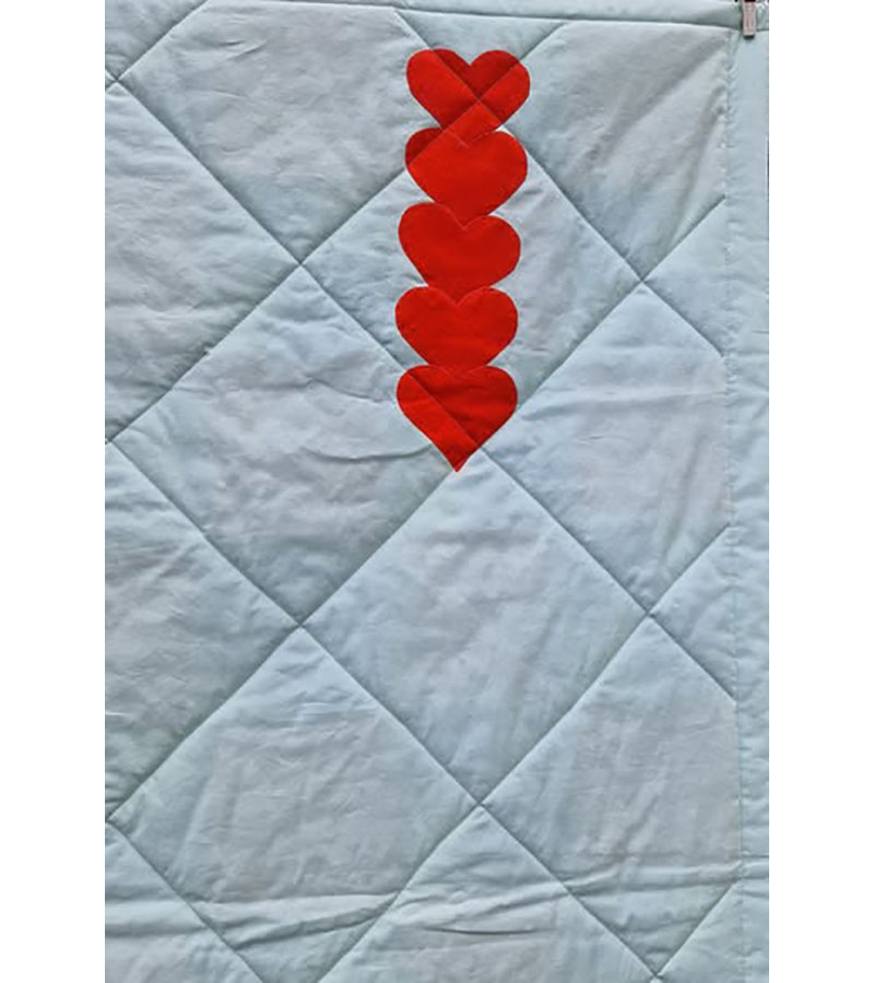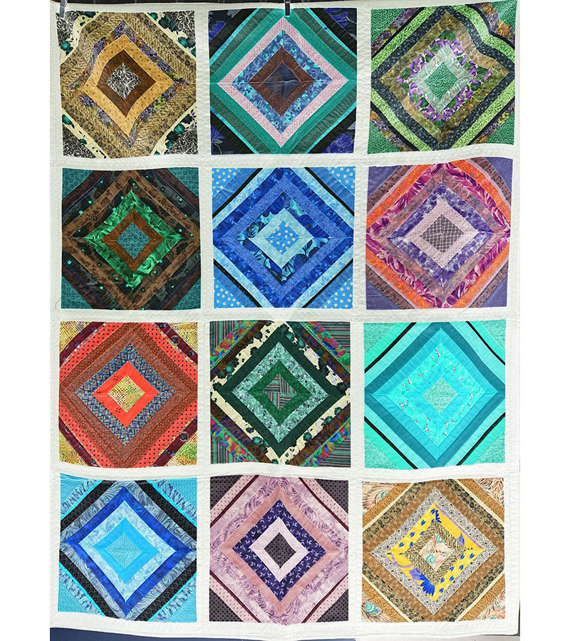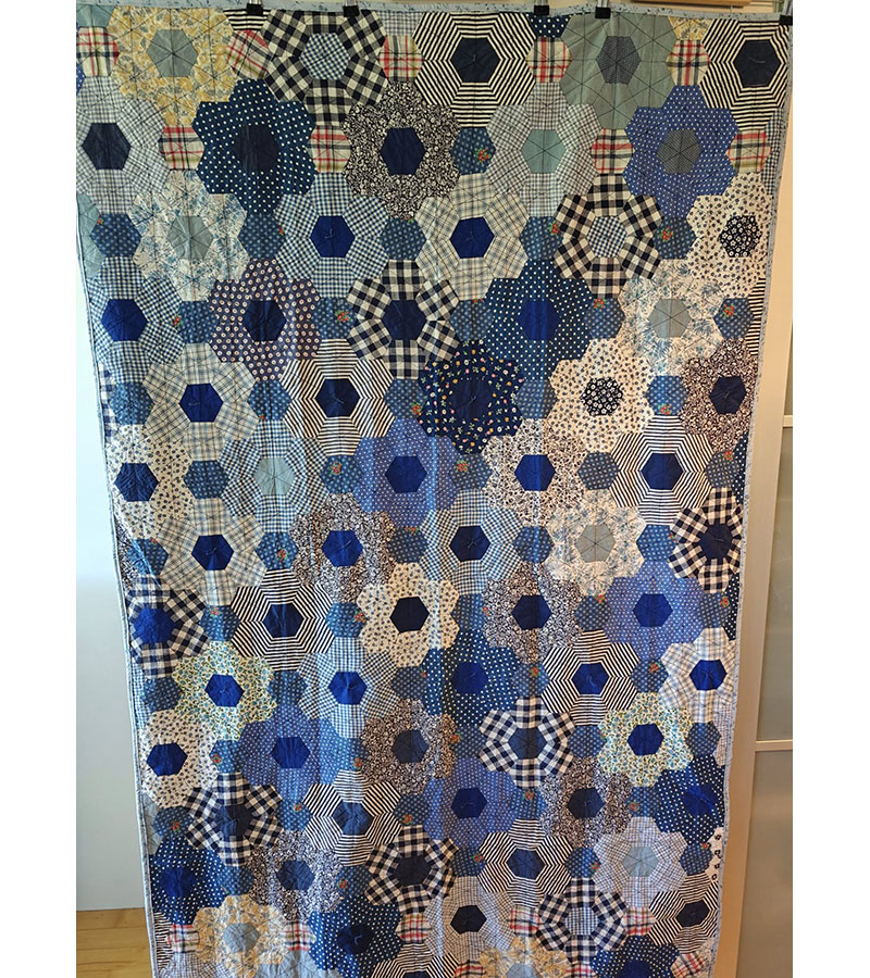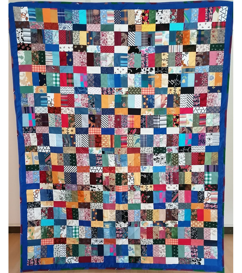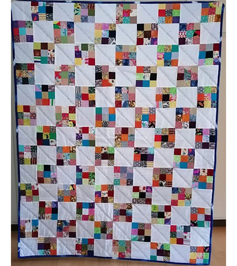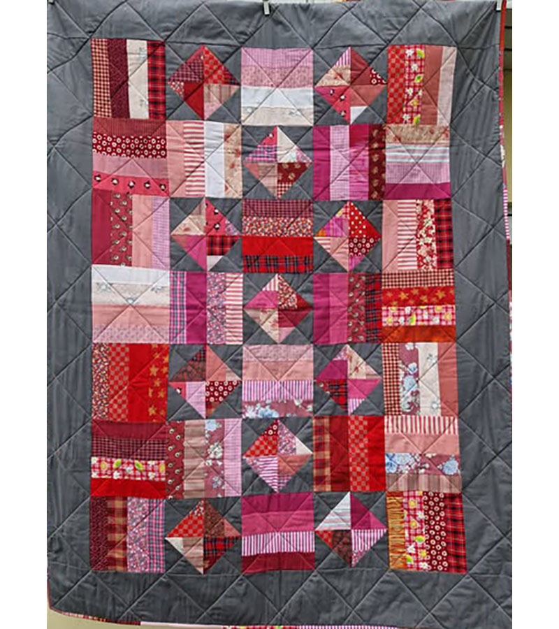 Dette fine tæppe er syet af nu afdøde Lone Olesen. Tæppet er uden mellemfor, så Alis Vesterbjerg Nielsen har doneret fleece og sat på bagsiden med knudequilt.