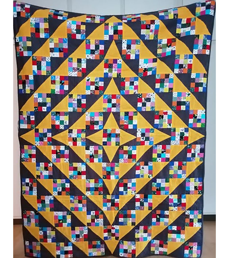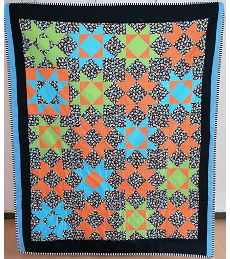 Denne flotte top er syet af nu afdøde Lone Olesen. Alis Vesterbjerg Nielsen har monteret og quiltet. Mellemfor er financieret af bogsalg. Bagstykke fra Projekt Puttetæpper.