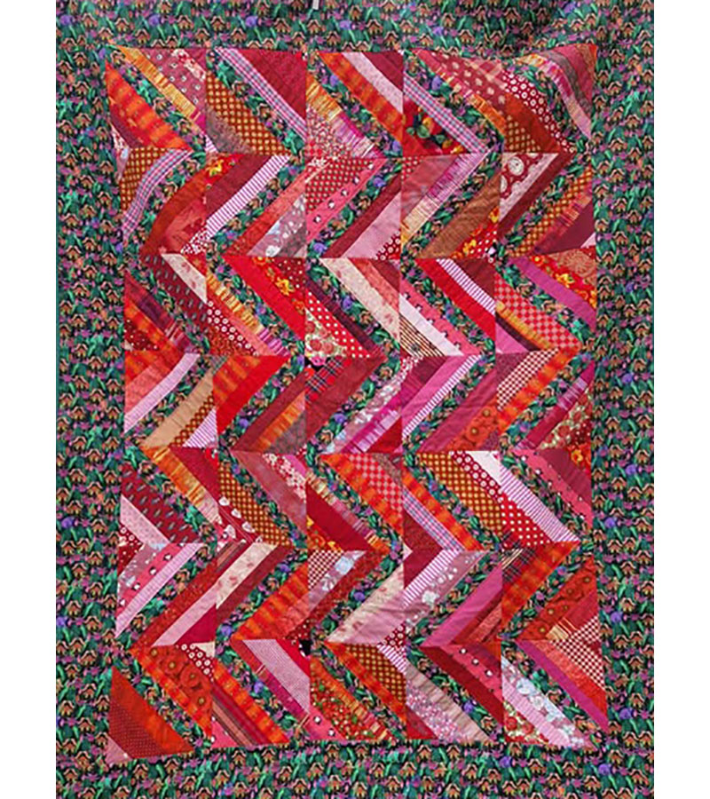 Anne Jensen og Helle Flandrup har benyttet samme mønster til strimmel tæppe, Anne i røde stoffer, Helle i grønne. Begge tæpper har mellemfor og bagside fra tantetræf (finansieret af bogsalg).