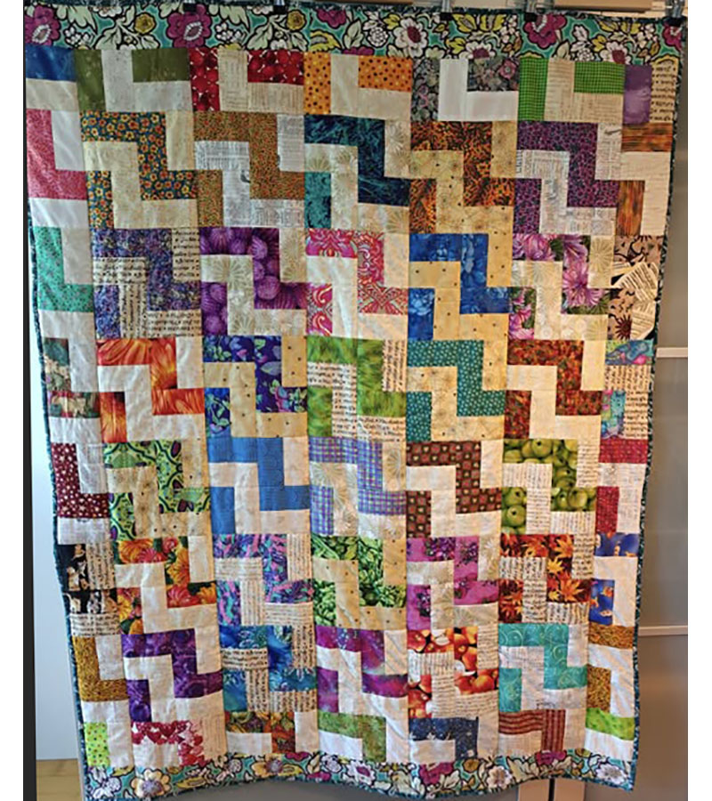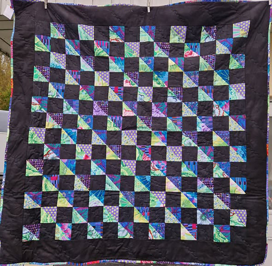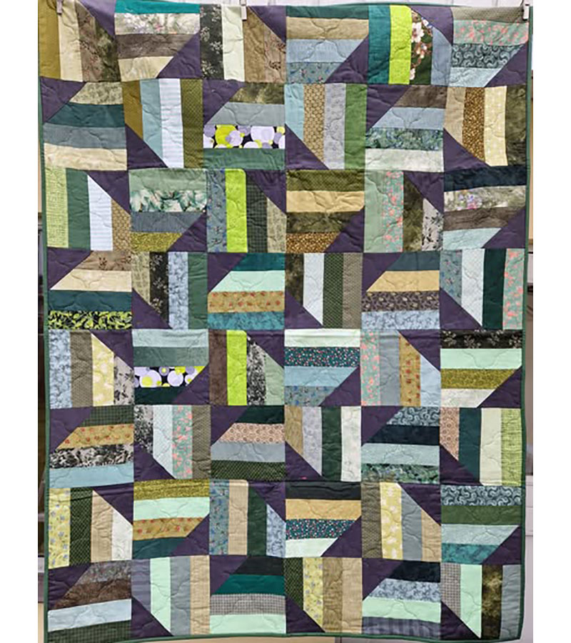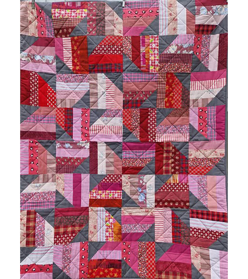Inge Lise Pedersen, Nørre Åby har syet denne flotte top. Alis Vesterbjerg Nielsen har øget med en kant i begge ender, så tæppet holder målene, monteret og quiltet. Mellemfor stykket sammen af rester fra andre monteringer .Bagstykke doneret.