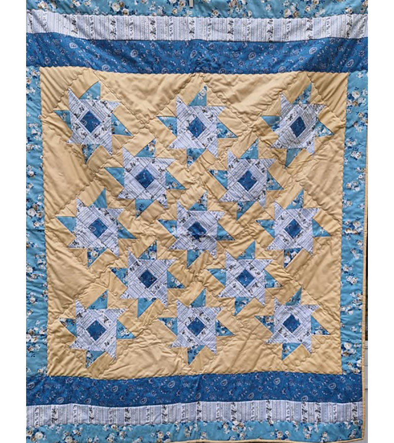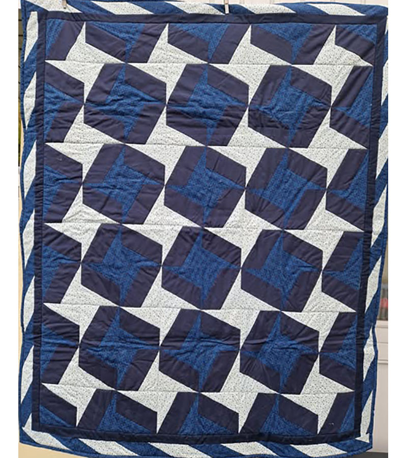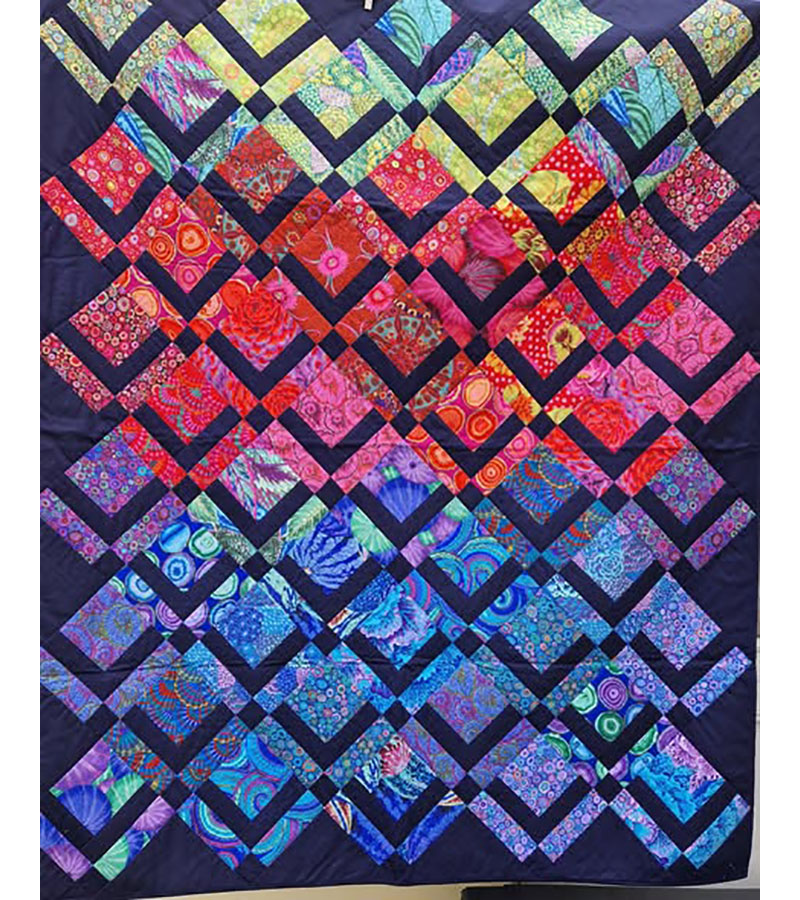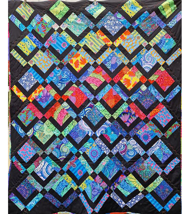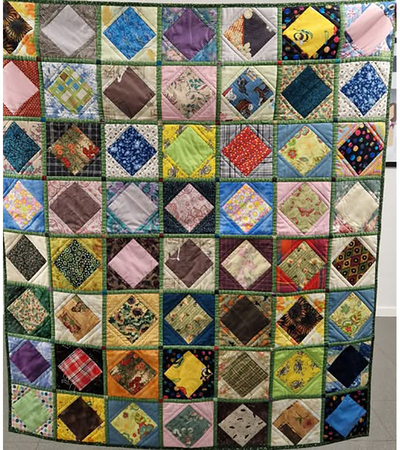 Inge Lise Pedersen, Nørre Åby har syet denne flotte top. Alis Vesterbjerg Nielsen har øget med en kant i begge ender, så tæppet holder målene, monteret og quiltet. Mellemfor stykket sammen af rester fra andre monteringer .Bagstykke doneret.