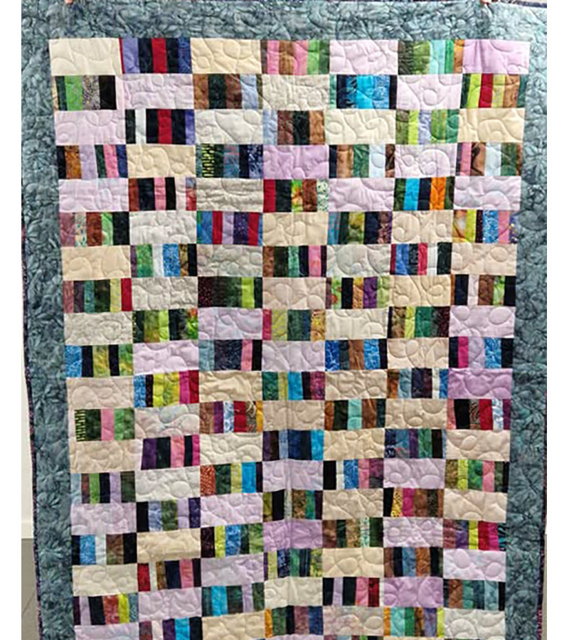 Connie Christensen, Hjallerup har syet dette fine restetæppe med system i strimlerne, så de danner et flot mønster. Mellemfor doneret fra bogsalg og Helle Pedersen har doneret bagsiden.