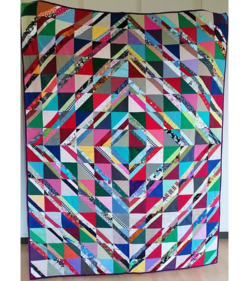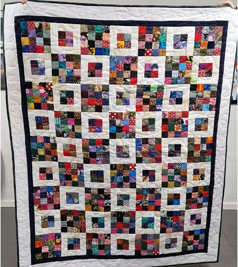 Dorthe Nielsen har farvesorteret strimler og syet et puttetæppe af skønne koncentriske blokke. Quiltequinderne I Greve har doneret sort fleece til bagsiden.
