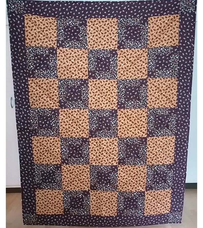Ulla Brønnum, Greve, tog en bunke brune stoffer med på kursus og blev inspireret til dette fine puttetæppe. På bagsiden lækker fleece, doneret af Quiltequinderne I Greve.