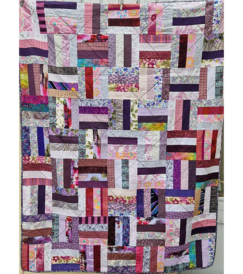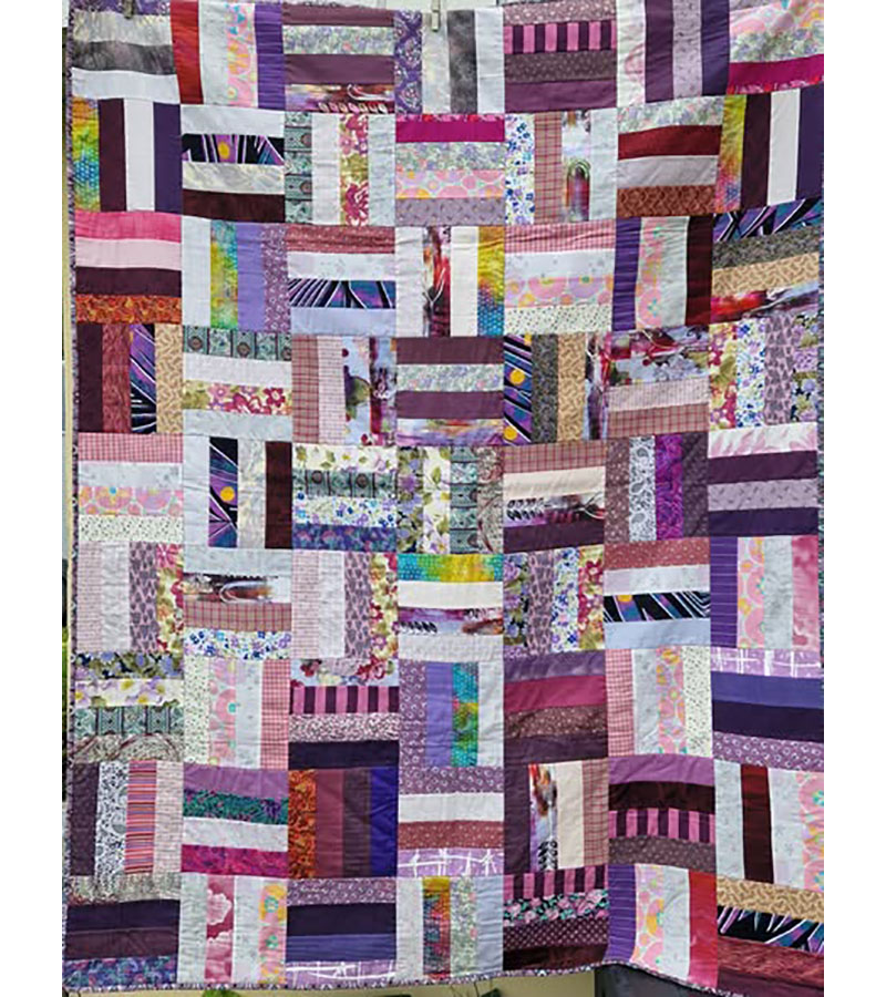 Lisbeth Molin har syet et dejligt puttetæppe med lilla rester. Flot med sorte kontrast striber. Bagsiden er også lilla, den og mellemfor er fra Tantetræf, finansieret af bogsalg.