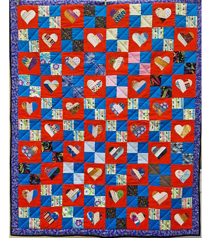 Jette Stilling Jørgensen har syet tæppet i “African Queen” mønster sf egne stoffer. Mellemfor er doneret af Betty Hannen Kristensen, bagside er doneret af Ingelise Hansen, lukkekant er doneret af Connie Karen Jensen.