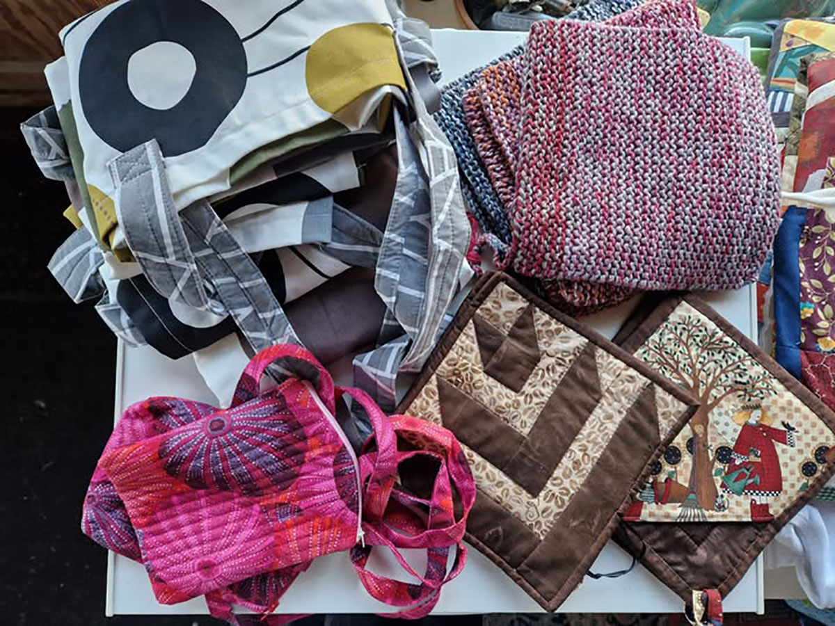 Morgenlevering på Maribo Craft Days fra “søstrene Sønderup”, 4 IKEA poser fra Marianne, 2 par strikkede grydelapper fra Lene og 2 par grydelapper og 2 mobiltasker fra Lone. Vi siger så mange tak!