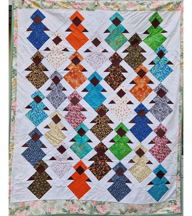 African Queen 1. november 2025 Af projektputte Jette Stilling Jørgensen har syet tæppet i “African Queen” mønster sf egne stoffer. Mellemfor er doneret af Betty Hannen Kristensen, bagside er doneret af Ingelise Hansen, lukkekant er doneret af Connie Karen Jensen.