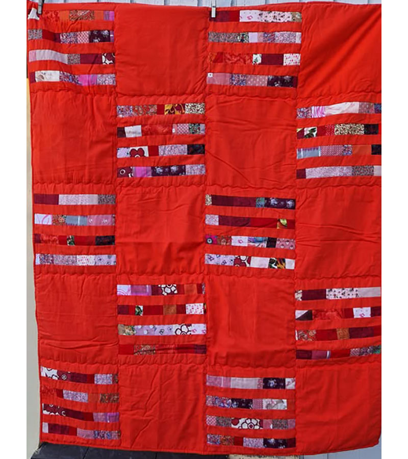 Rødt tæppe med kulørte strimler 1. november 2025 Af projektputte Lene Sørensen, Sakskøbing, har syet strimler af de mindste rester og sat ind i et rødt puttetæppe, meget virkningsfuldt.