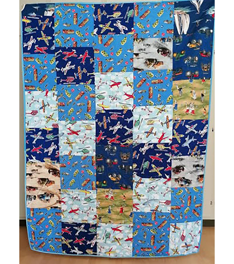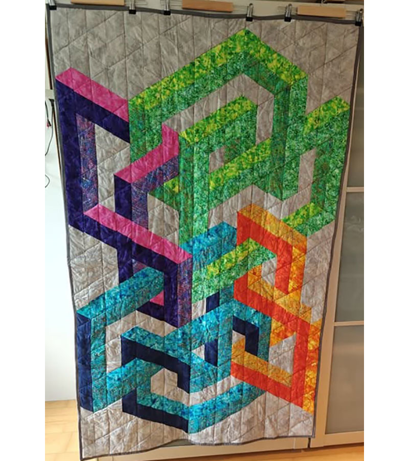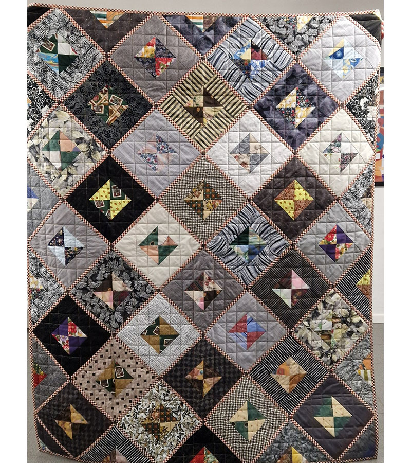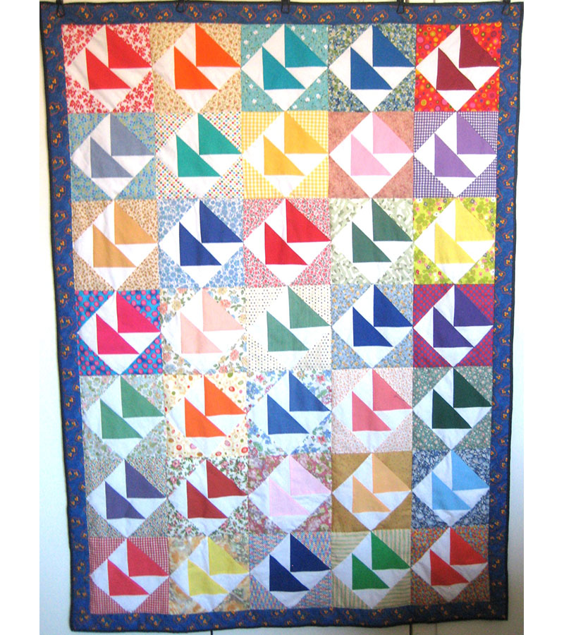Farverig top syet af anonym, mellemfor er finansieret af bogsalg, bagsiden doneret af Birgit Munk. Ane Marie Ridder har quiltet tæppet.