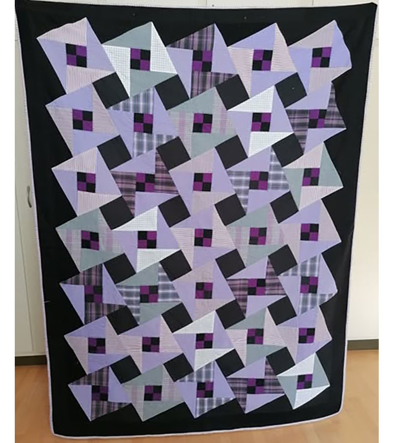 Lisbeth Adrian skriver: En meget gammel UFO blev færdig. For 6-8 år siden, var der en pose pap-blokke tilovers efter et tantetræf. Smukt syet, alle i skjortestoffer. Jeg syede hvide firkanter i mellem de mange blokke, og det første tæppe blev færdigt for nogle år siden (før corona), og nu er det andet tæppe så også færdigt.