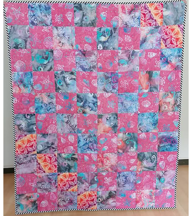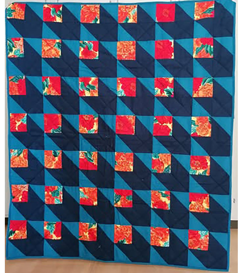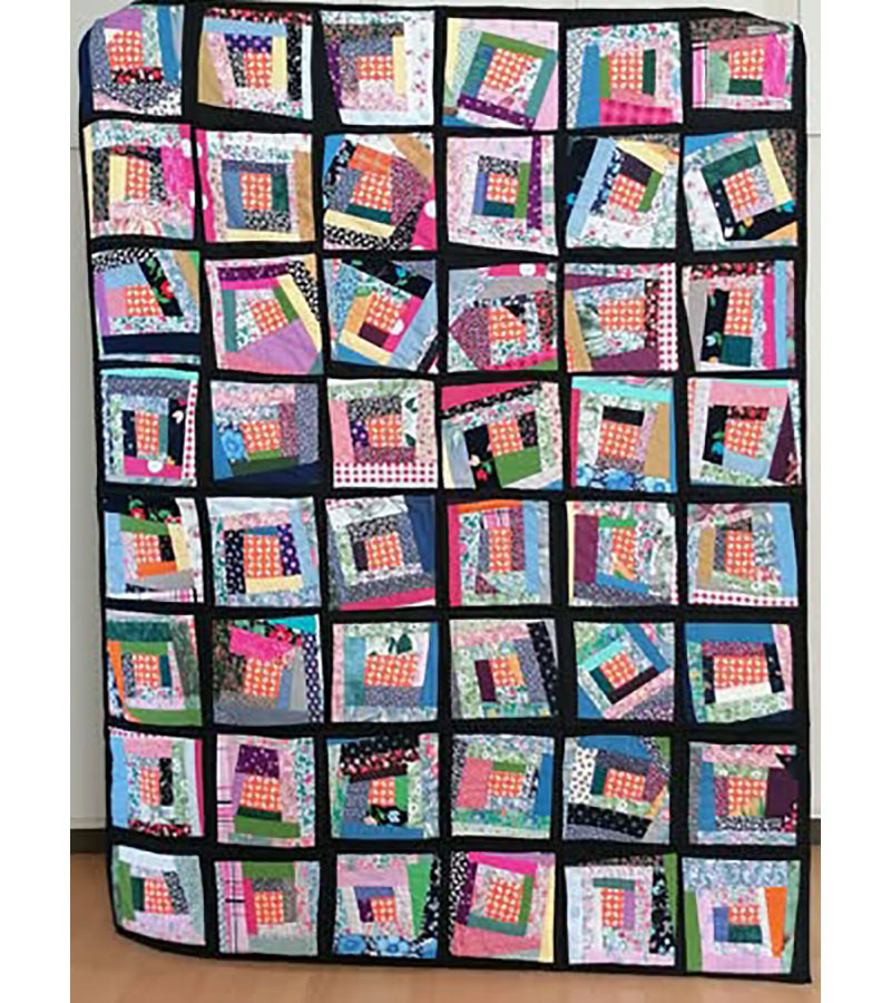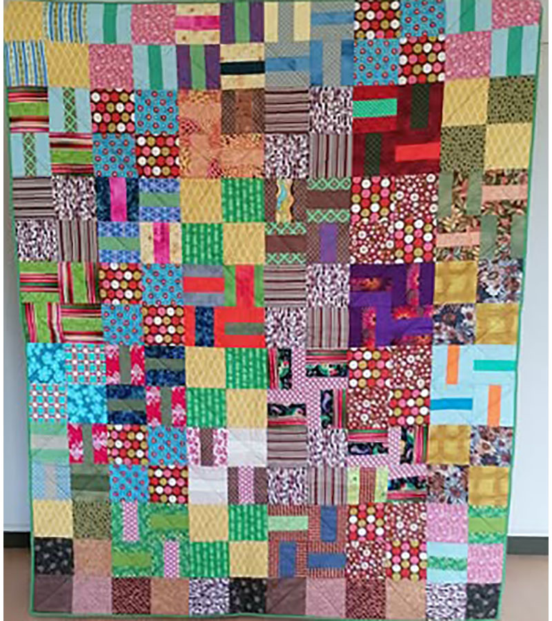 Annette Jacobsen, Støvring, har endnu en gang syet et fantastisk puttetæppe af 2×2 cm. firkanter. Karin Holme Frederiksen, Skørring, har monteret og quiltet, mellemfor er finansieret ved bogsalg, og Ilse Iversen, Ryomgård, har doneret bagsiden. Bemærk de halve ens blokke hele vejen rundt i kanten, der giver et roligt udtryk omkring de mange brogede blokke.