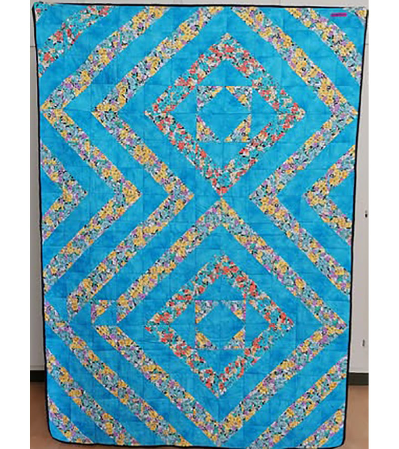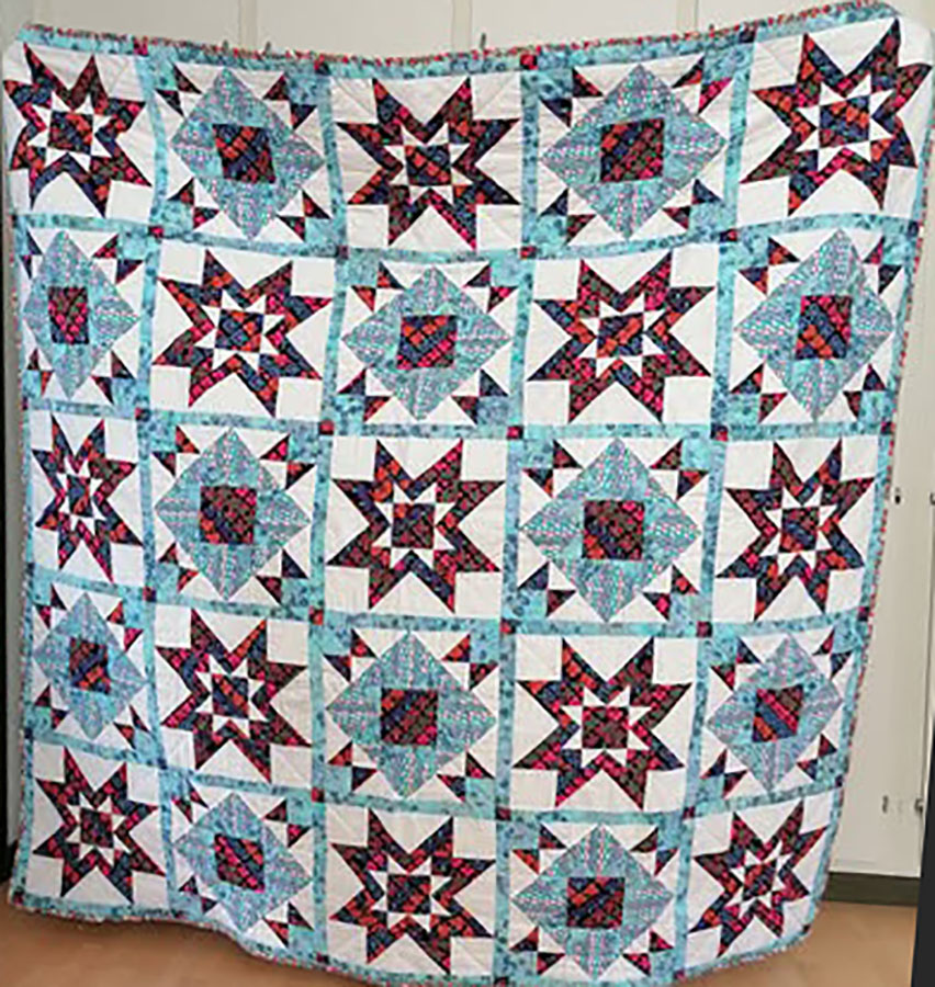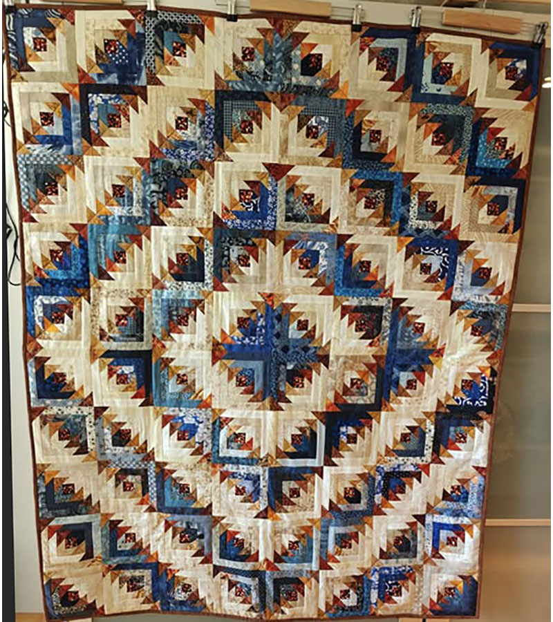 Lisbeth Adrian skriver: “De brune stoffer er ikke så populære blandt tæppetanterne. Jeg har derfor brugt nogle af dem til dette tæppe, hvor jeg har kombineret med turkise stoffer. Modellen set på Pinterest. Til den anden side af tæppet har jeg brugt en kagedåse fuld af donerede 3×3 cm papper og færdiggjort efter Maud Sandquist’s mønster fra DPF’S 25 års jubilæum hæfte. Jeg er ellers ikke vild med at sy over pap, men det var sjovt at designe hver enkelt blok undervejs”.