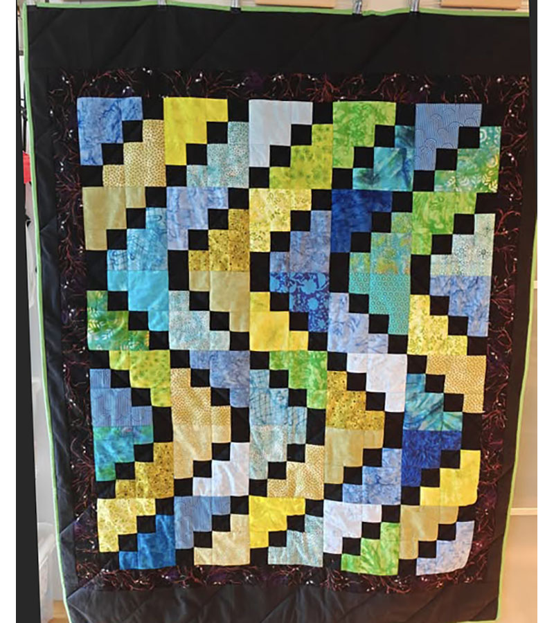 Sort/hvid top med flot grafisk mønster syet af Anni Wasiri. Mellemfor fra bogsalg, bagside doneret af Karin Holme Frederiksen, monteret og quiltet af Ane-Marie Ridder, Køge.