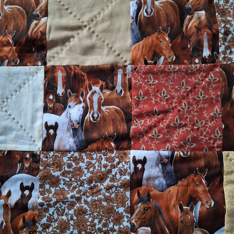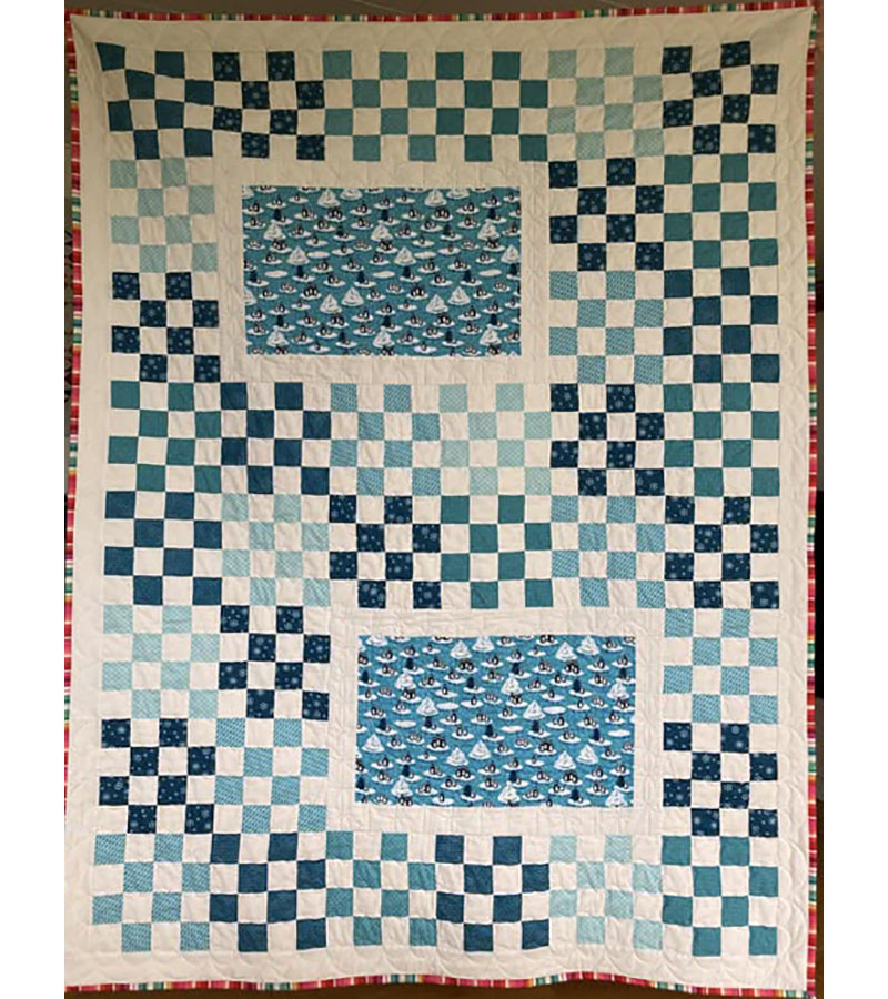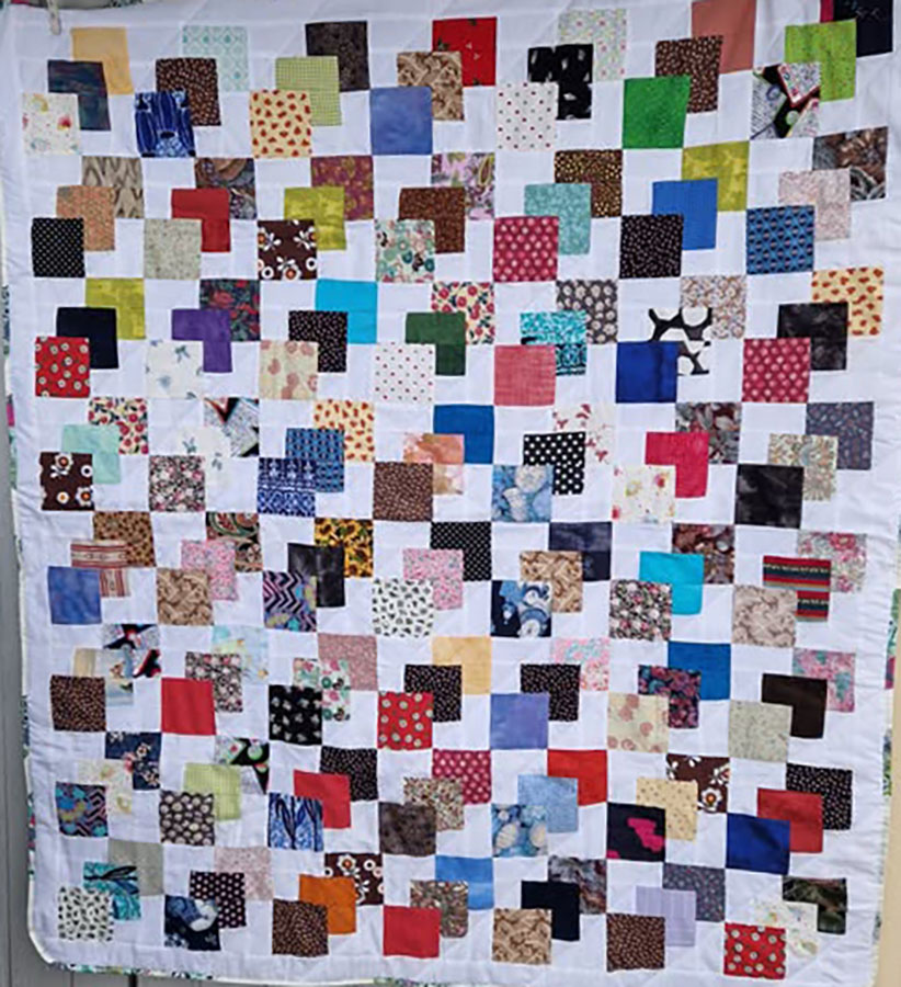 Annette Jacobsen, Støvring, har endnu en gang syet et fantastisk puttetæppe af 2×2 cm. firkanter. Karin Holme Frederiksen, Skørring, har monteret og quiltet, mellemfor er finansieret ved bogsalg, og Ilse Iversen, Ryomgård, har doneret bagsiden. Bemærk de halve ens blokke hele vejen rundt i kanten, der giver et roligt udtryk omkring de mange brogede blokke.