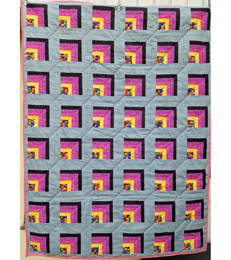 Afdøde Rita Nørgaard har syet det flotte Snail Trail tæppe, som Karin Holme Frederiksen har monteret og quiltet. Mellemfor er finansieret ved bogsalg, og Ilse Iversen, Ryomgård, har doneret bagsiden.