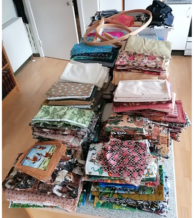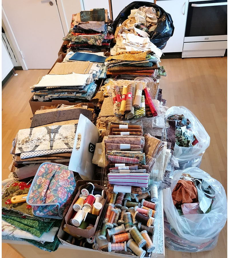 Susanne Triel, Esbjerg, skriver: “Denne top begyndte jeg på i går og er næsten færdig med at sætte den op på quiltemaskinen. Kravet er, at det skal være stof, jeg har i mine gemmer. Billederne fandt jeg ,da jeg ryddet op i mine gemmer, er sikkert fra et Tæppetante træf for år tilbage, resten er fra eget lager”.