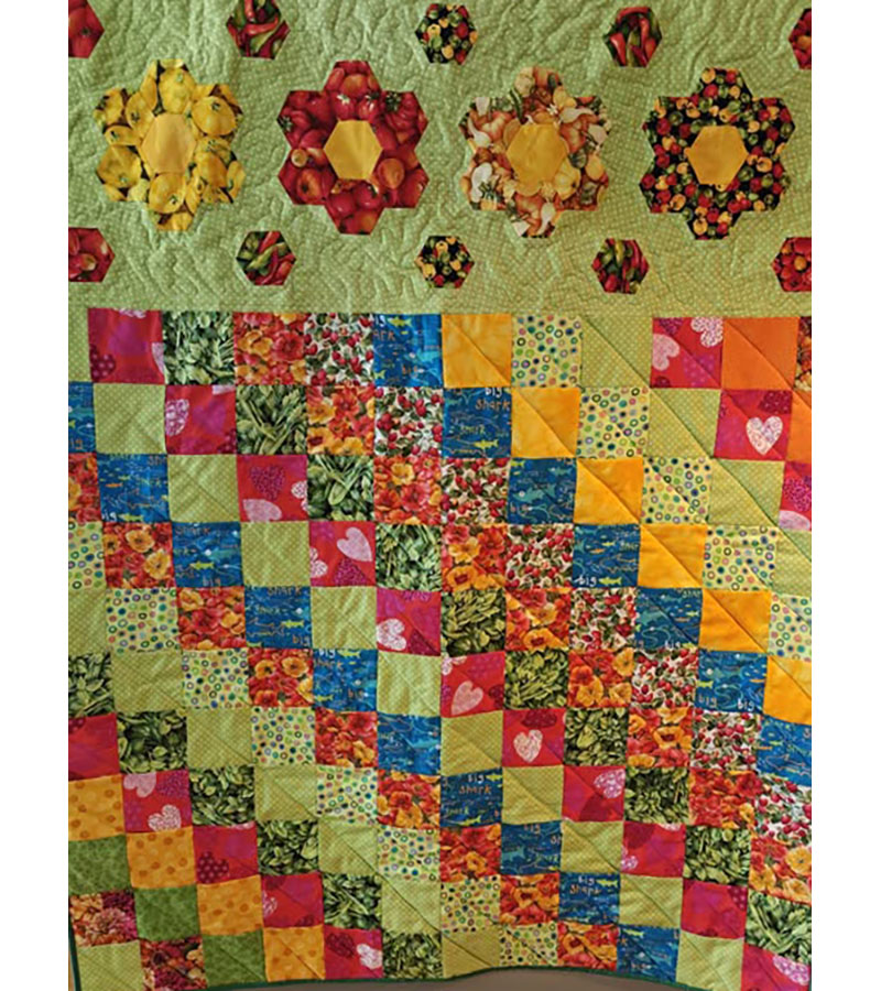 Lena Andersen, Skælskør, har syet toppen, Ann-Leila Sønderby, Vordingborg, har quiltet med mellemfor finansieret af bogsalg og bagside doneret af Bankegården. Mønster er Middelfart tæppet fra HANNES Patchwork.