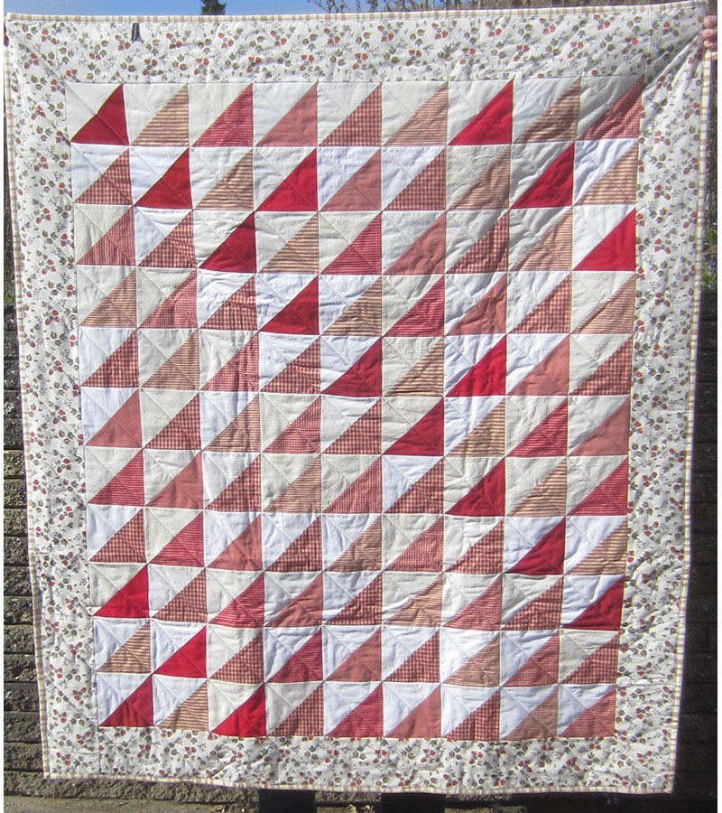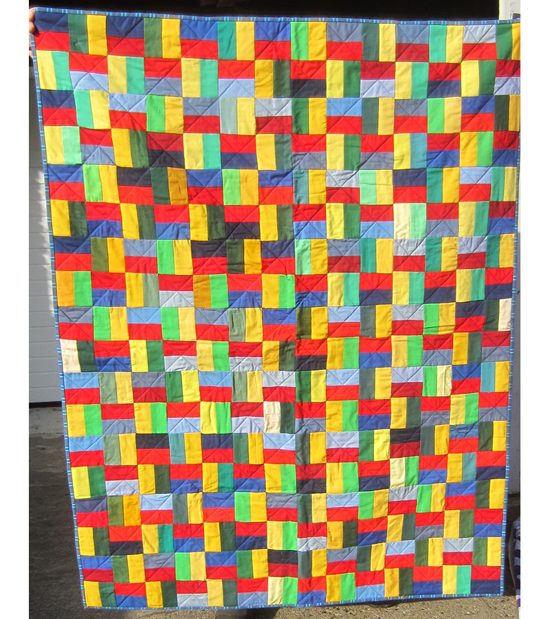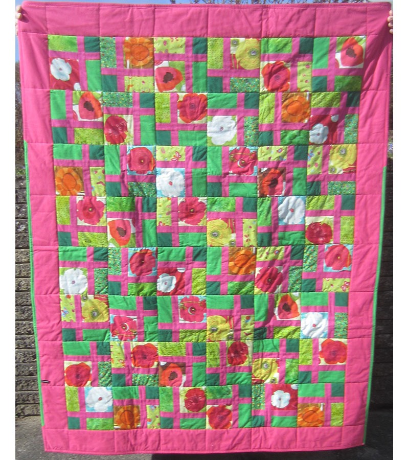 Jette Stilling Jørgensen skriver: “Tæppe syet ved fælles hjælp i Aktivcenter Skovlunde. Bagside og lukkekant doneret af Connie Karen Jensen. Ellers stoffer fra eget lager”.