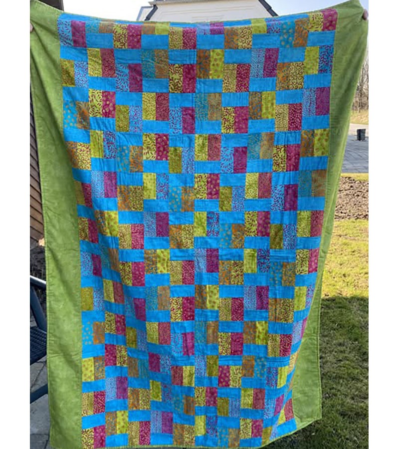 Dette smukt farvekoordinerede puttetæppe er resultatet af et samarbejde af patchworkpiger i Ebeltoft/Tved. Søstrene Bente Thomsen og Janne Andersen har syet toppen af mange små firkanter, og Mette Ebbesen har quiltet tæppet. Mellemfor er finansieret ved bogsalg, og Hanne Schrøder, Fredericia, har doneret bagside.