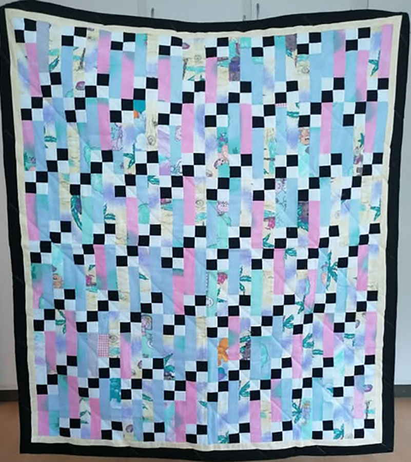 Pastelfarvet tæppe 15. november 2025 Af projektputte Inger Olsen, Tølløse har syet dette tæppe i pastelfarver og sort kontrast. Mellemfor fra bogsalg og bagside fra donation.