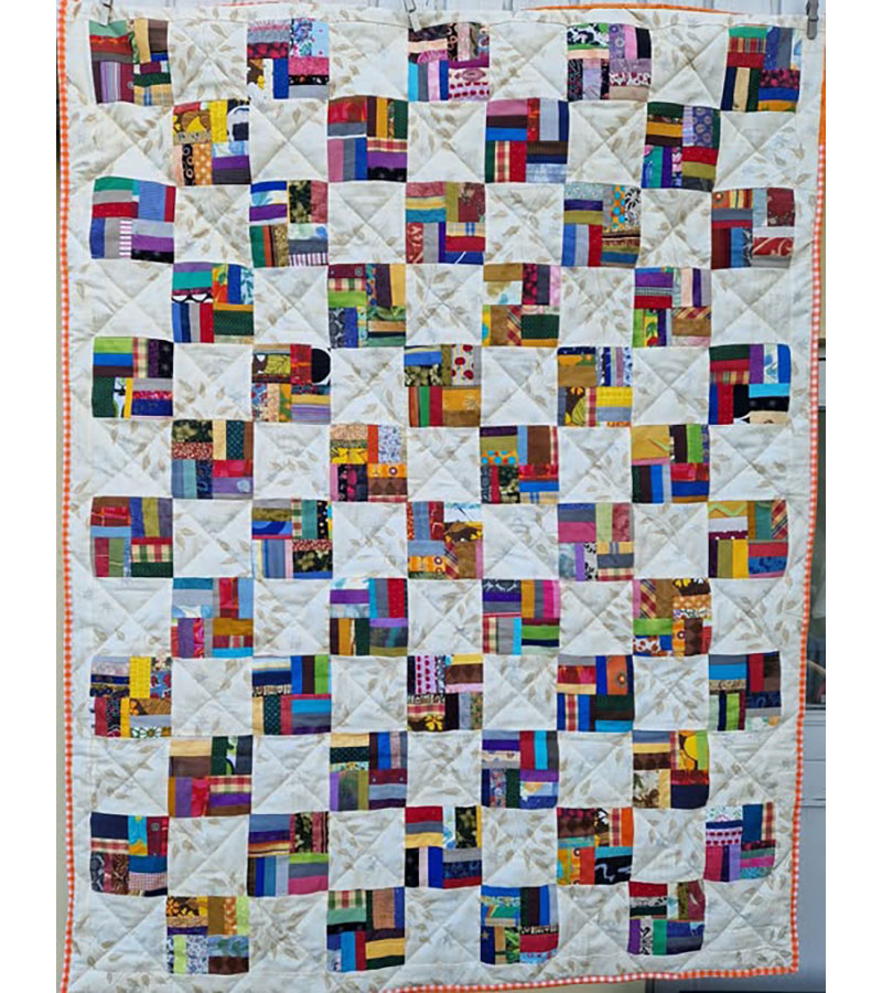 Rester + ensfarvet 1. december 2025 Af projektputte Flot restetæppe fra Aase Rosebi Sommer, Thurø. Monteret af Lisbeth Adrian med mellemfor finansieret af bogsalg og bagside fra Aase.