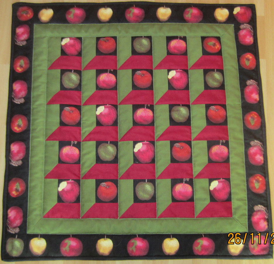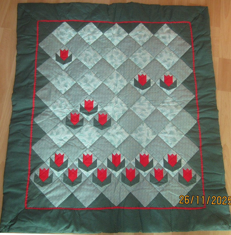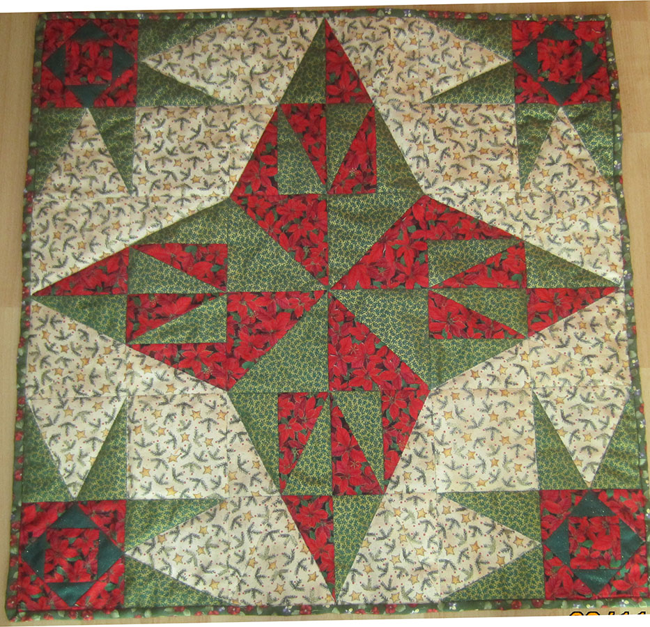 Afdøde Rita Nørgaard, Randers, syede 3 små fine tæpper/juleduge/juletræstæpper eller hvad hun nu har tænkt, de skulle bruges til. Karin Holme Frederiksen, Skørring, har monteret og quiltet samt afleveret tingene til Julemærkehjemmet i Hobro, der evt. kan bruge tingene til tombolagaver til julemærkemarchen.