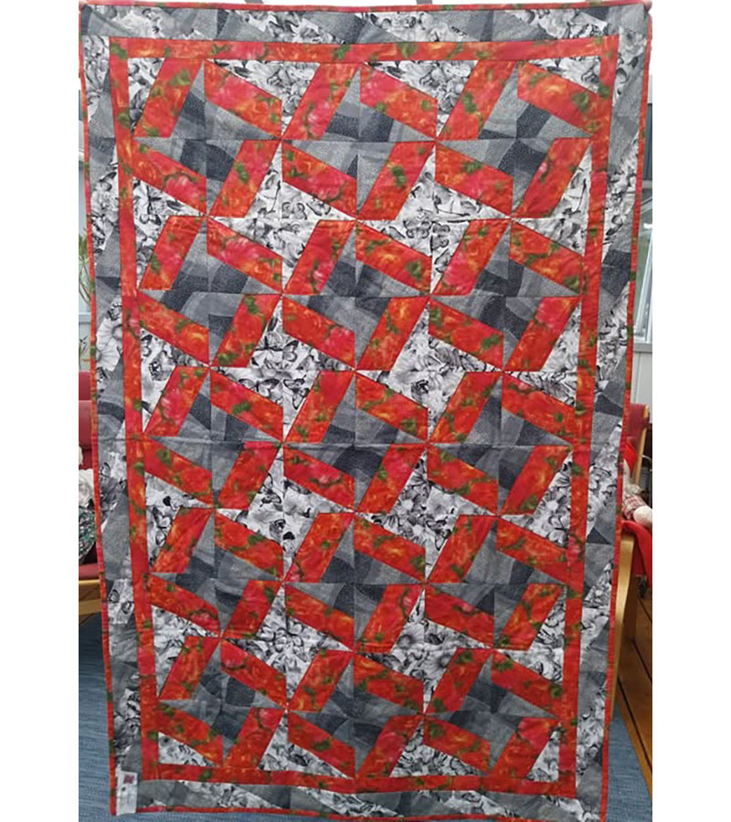 X-block tæppe i rødt og gråt, syet af Ellen Hansen, Greve af egne materialer.