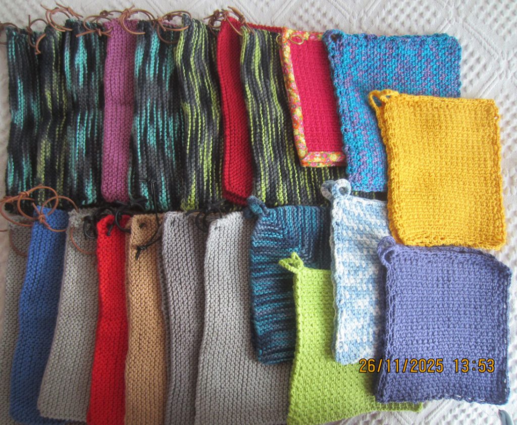 21 par grydelapper 8. december 2025 Af projektputte Hanne Beck, Vejerslev, har haft gang i pindene og strikket/hæklet 21 par tykke grydelapper.