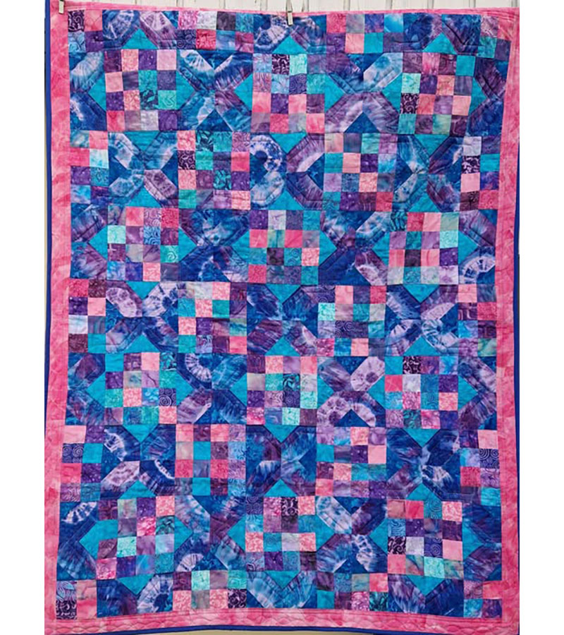Flot top i batikstoffer, syet af afdøde Helle Tolborg, Aars. Ann Christiansen, KvintaQuilts.dk, har doneret bagside og lavet en flot longarm quiltning.