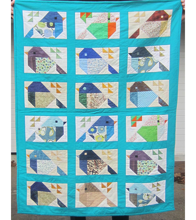 De mange små fugle er syet af medlemmer fra Grenaa Patchwork Forening. Der er tyk, fed fleece på bagsiden.