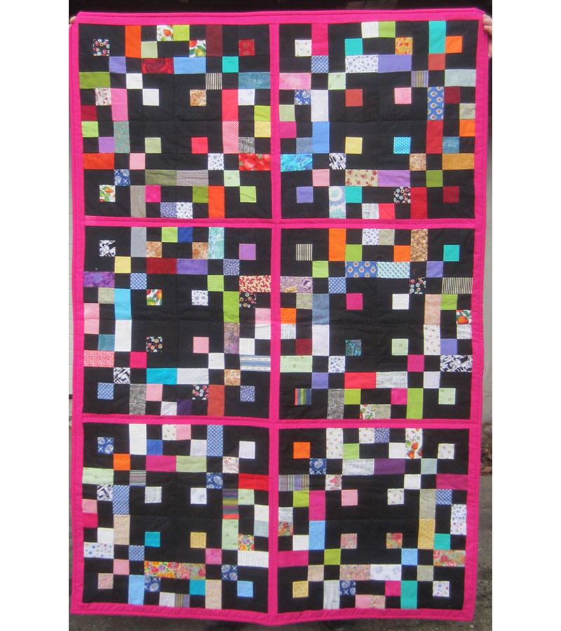 Restetæppe 5. januar 2026 Af projektputte Karin Holme Frederiksen, Skørring, har syet puttetæppet efter mønster fra Hannes Patchwork, Mellemfor finacieret ved bogsalg, og bagsiden er doneret af Ilse Iversen, Ryomgård.