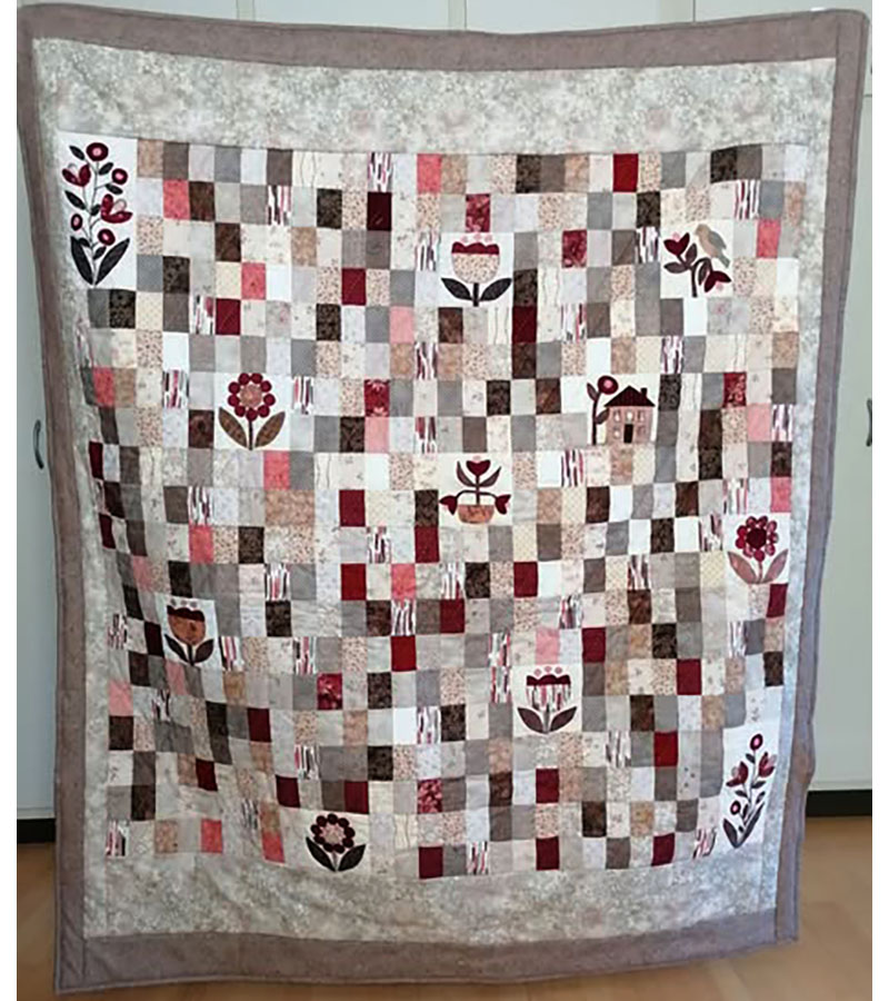 Blomster og firkanter 8. januar 2026 Af projektputte Susanne Christensen, Rødovre har påbegyndt dette flotte, håndsyet tæppe med applikationer. Inger Olsen har færdigmonteret.