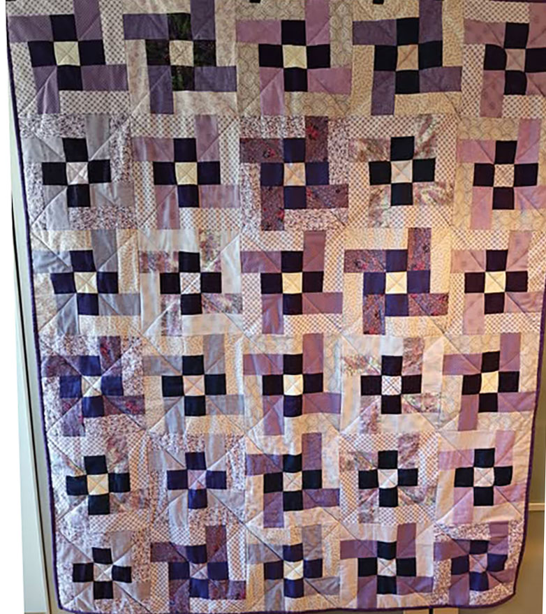 Kirsten Hansen fra Nyborg har syet dette fine lilla tæppe. Toppen var påbegyndt arbejde, som Kirsten fandt på træf i Hejnsvig, tyndt mellem foer doneret af Kirsten og bagside i lilla fleece fra projekt puttetæpper.