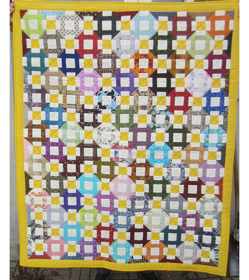 Det smukke puttetæppe er syet af anoym, monteret og quiltet af Karin Holme Frederiksen. Mellemfor er finansieret ved bogsalg, og bagsiden er fra puttetæppelageret.