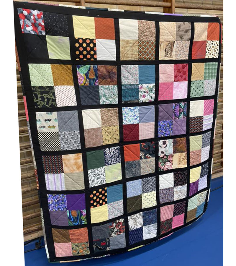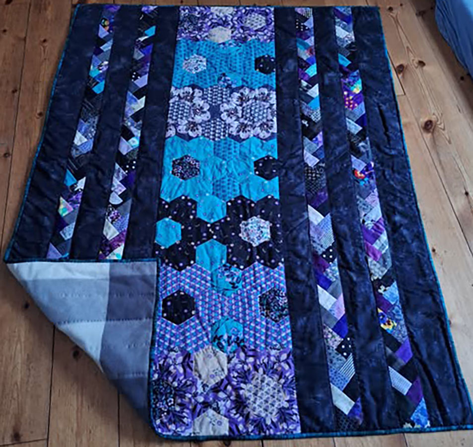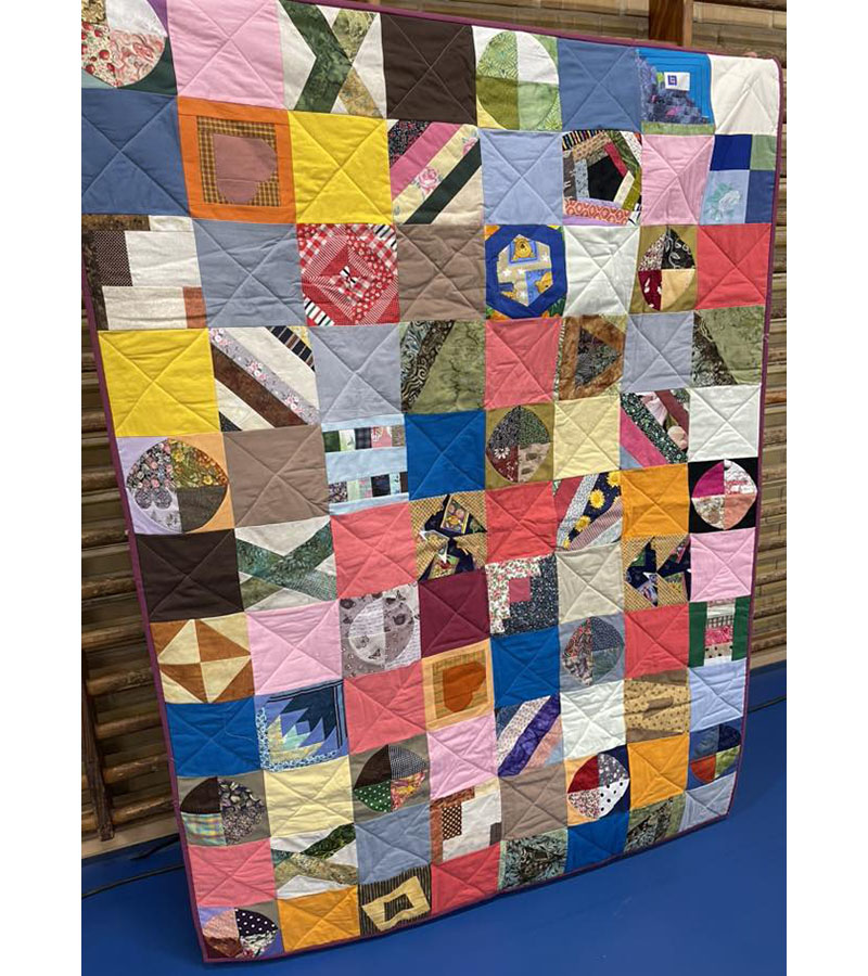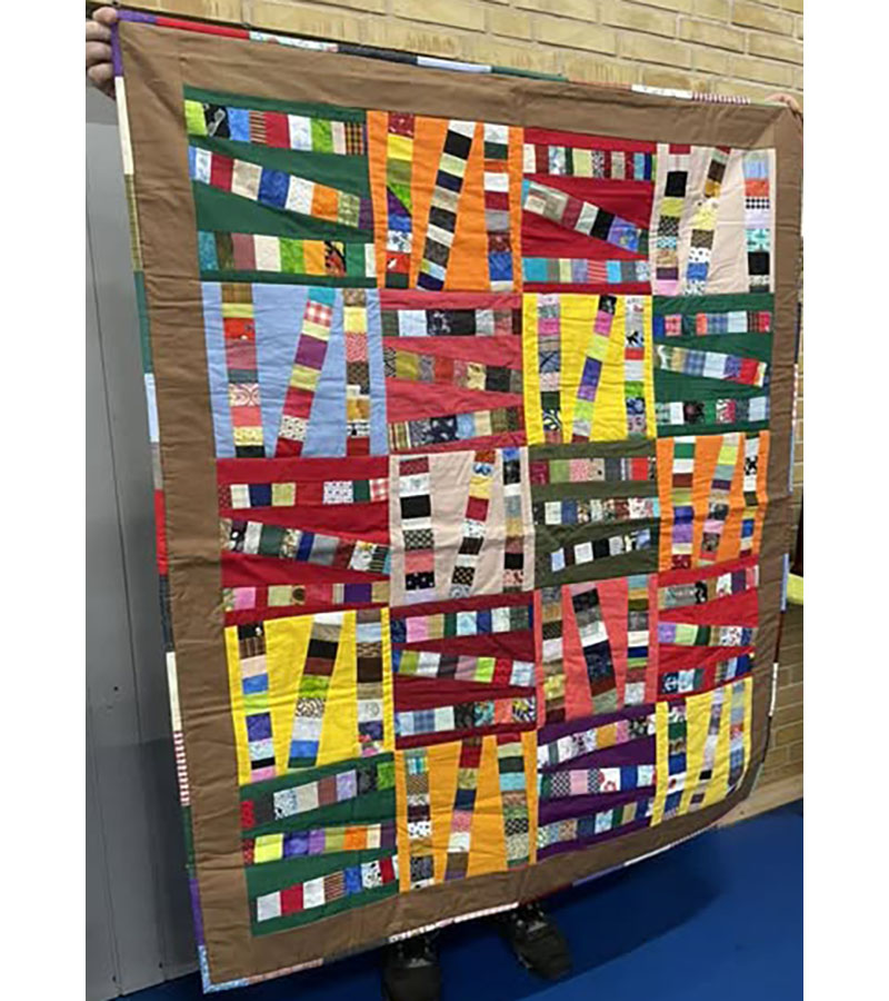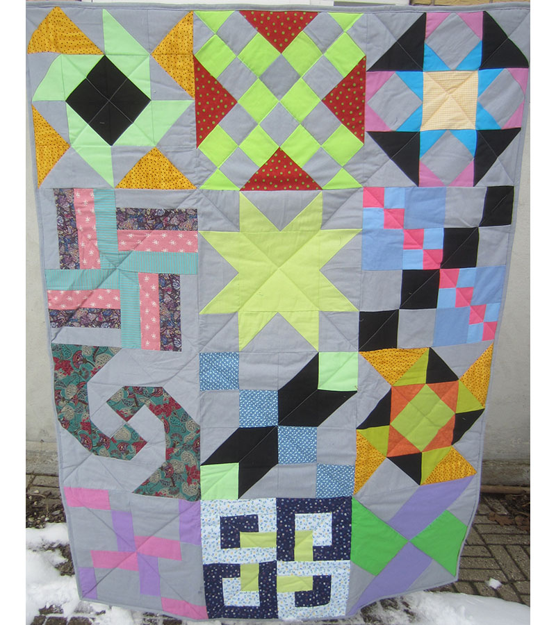 1 tæppe er blokkene syet af nogle piger til 24 Timer I Hjallerups event, mange har doneret stof rester, jeg har syet og monteret dem”.